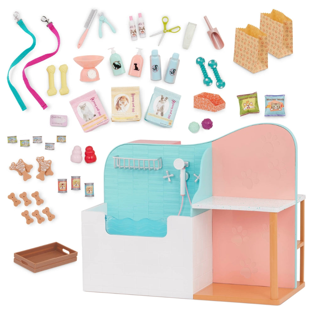Уникални аксесоари за куклата Groomer от Our Generation, предназначена за грижа за домашни любимци.