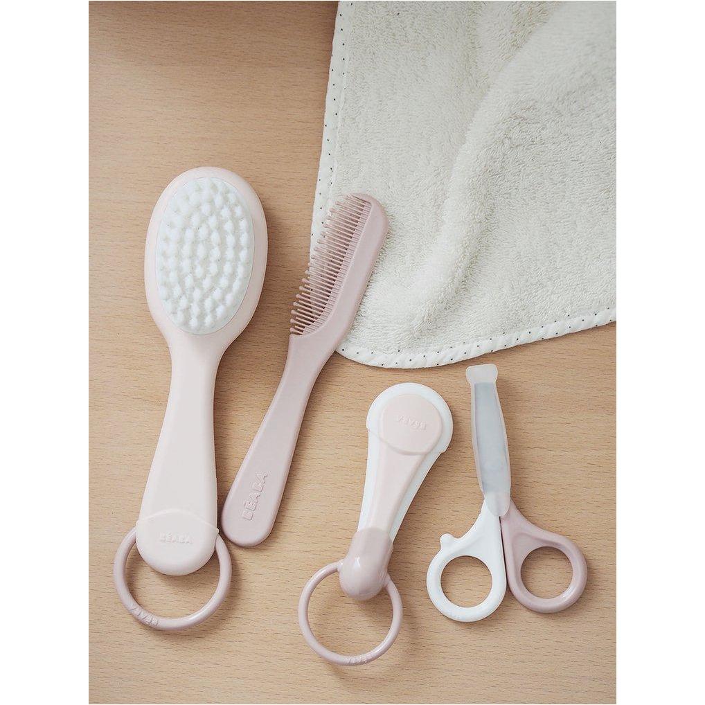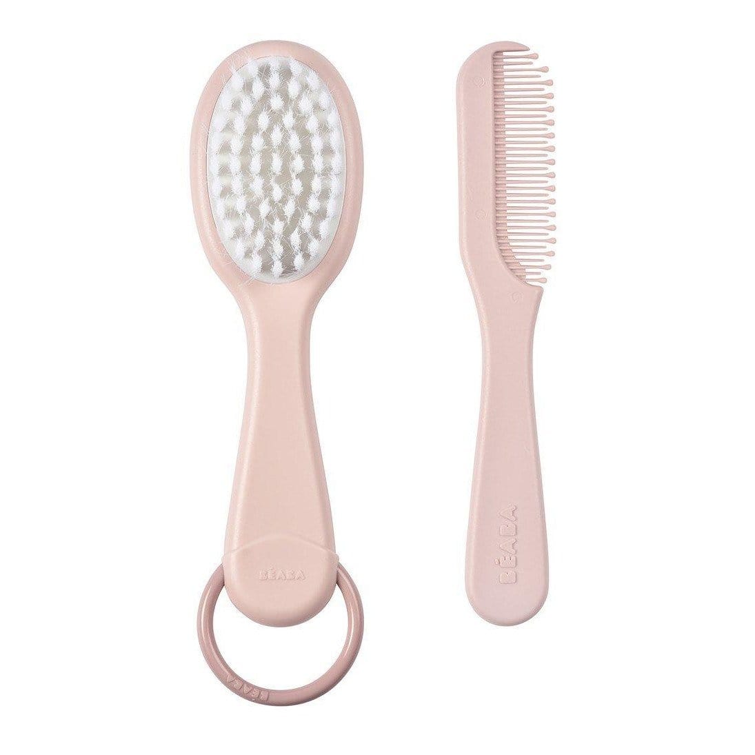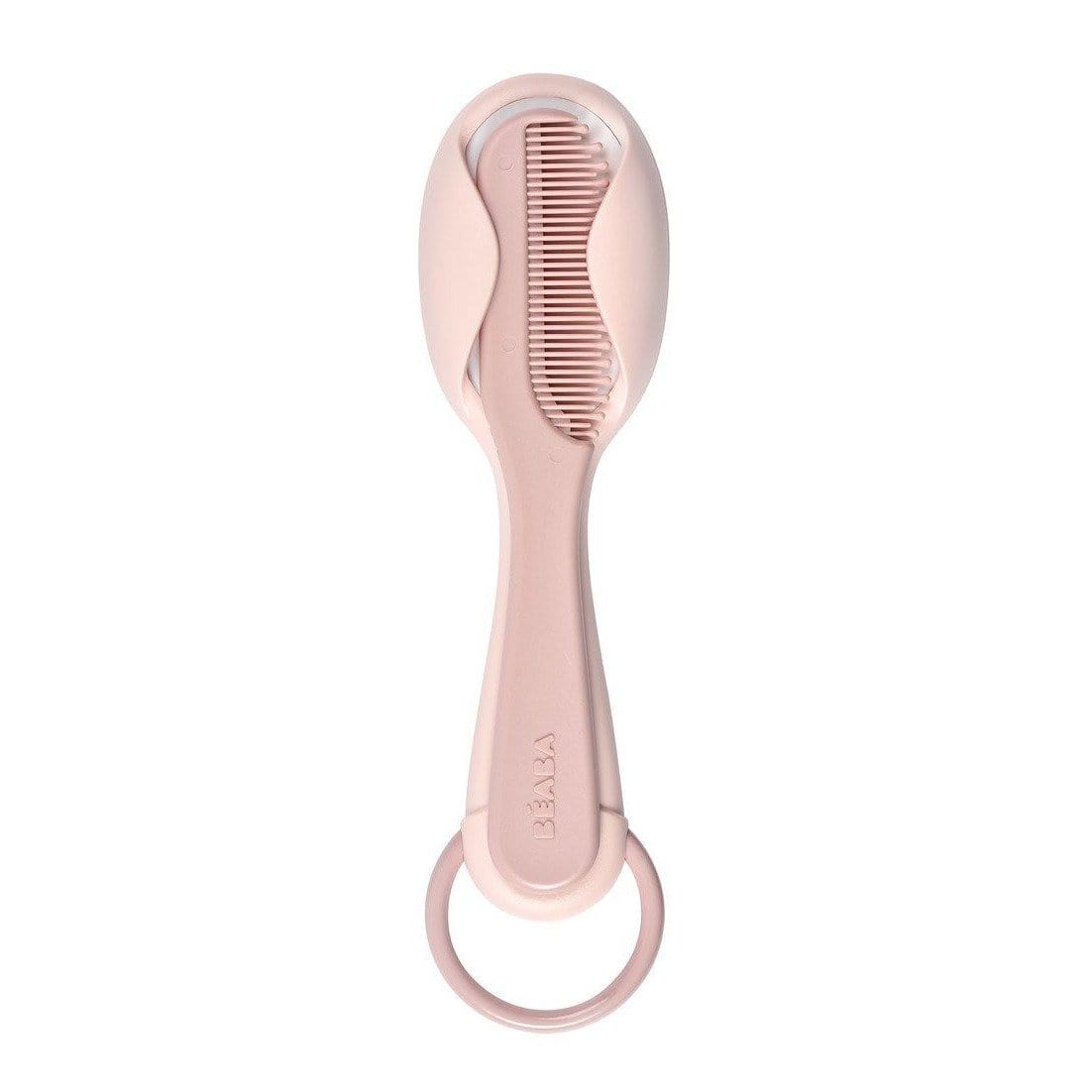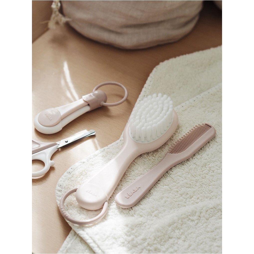 Комплектът за грижа за косата в цвят Old Pink на френската марка Beaba се състои от четка с много меки найлонови влакна и гребен с заоблени зъбци.