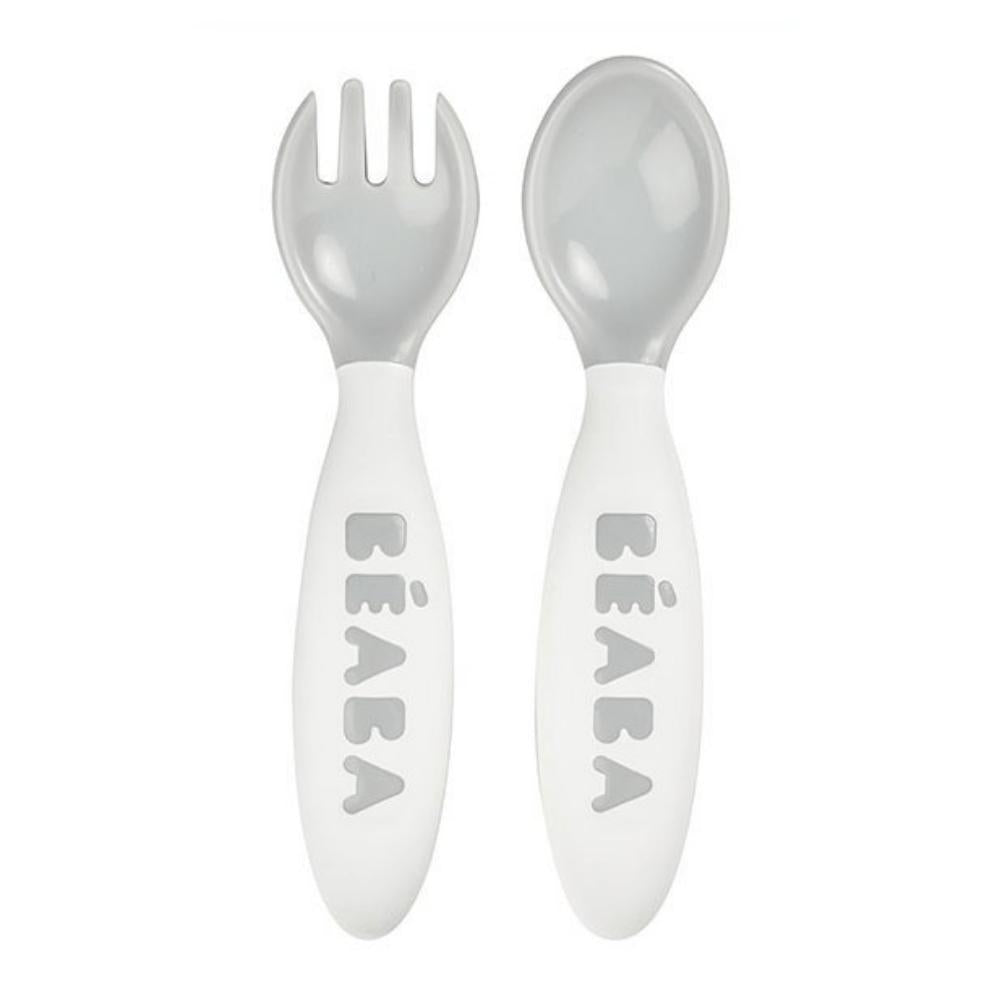 Детските прибори в сив калъф на френската марка Beaba са с форма, която ги прави лесни за държане дори от малки деца.