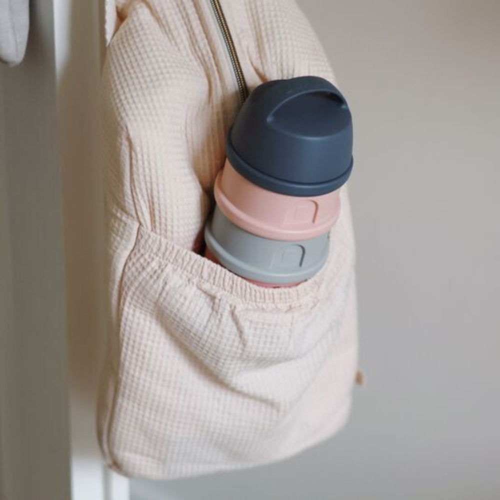 Контейнерите за мляко на прах са в графитен, розов, светло сив и пастелно розов цвят и имат обща вместимост 440 мл (4x110 мл).