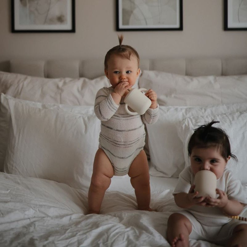 Силиконовата чаша със сламка Shifting Sand на Mushie е чудесен продукт, който улеснява прехода на бебето от бидон към нормална чаша.
