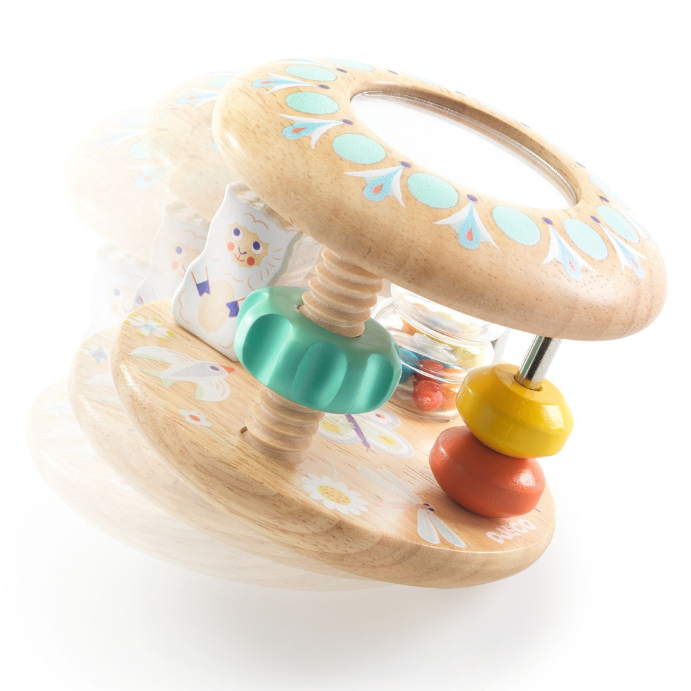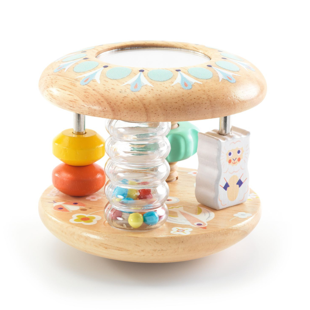 Тази компактна играчка в меки пастелни цветове е изработена от естествено дърво и кани вашето дете да проучи до шест дейности: да завърта малката овца, да движи мънистата, да я търкаля настрани, да гледа как падат мънистата, да завинтва цветчето и да се гледа в огледалото.