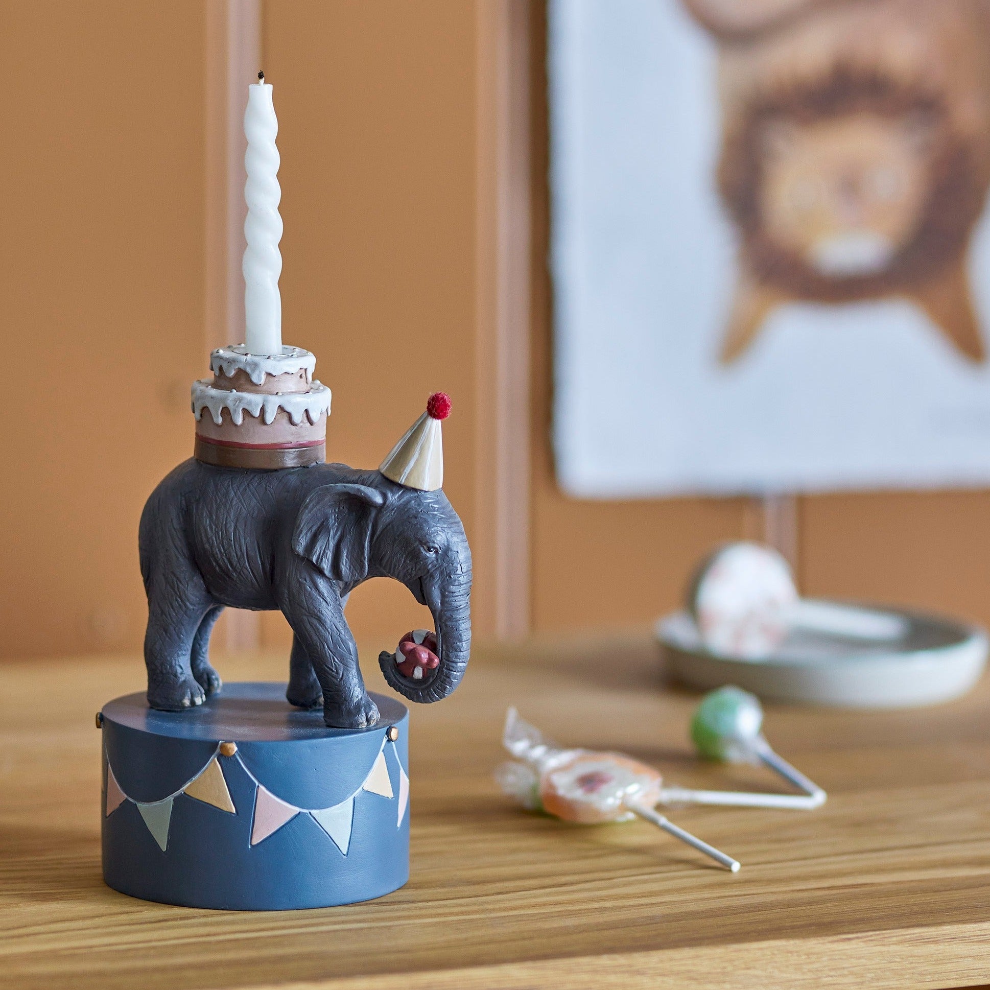 Свещникът във формата на слон с огромна торта на гърба е очарователен аксесоар за рожденния ден на вашето дете.