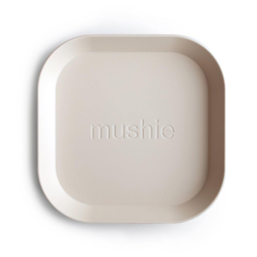 Комплектът квадратни чинии Mushie в цвят слонова кост е създаден за първите самостоятелни хранения на вашето дете.