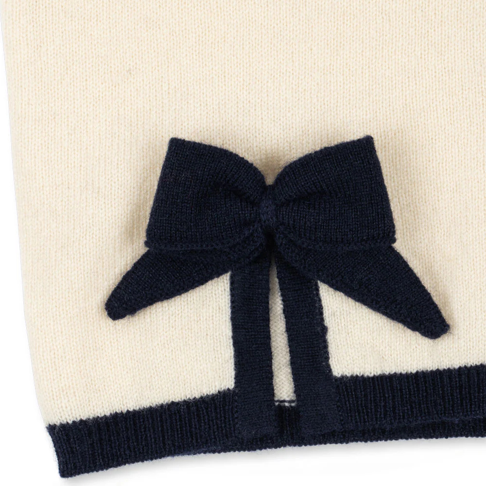 Този детски пуловер е с класическа кройка, с кръгла яка, контрастни кантове и копчета от перла, нежните панделки придават фин чар.