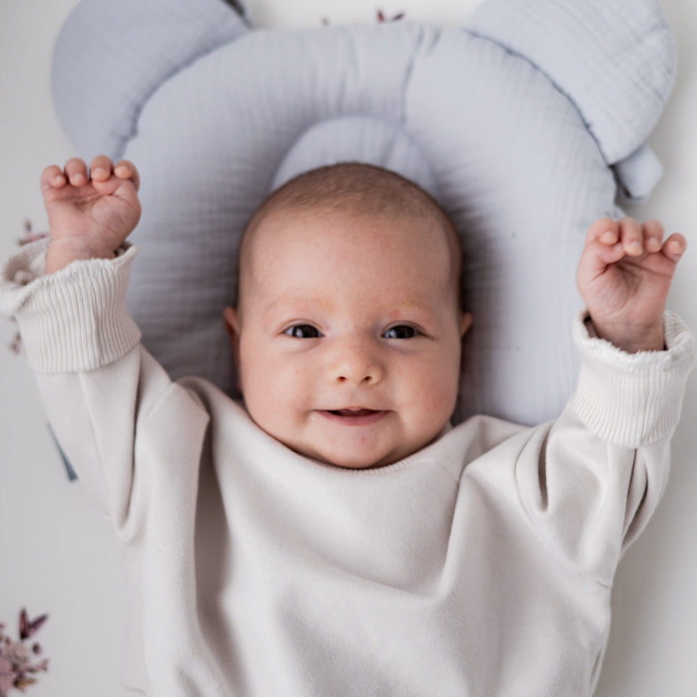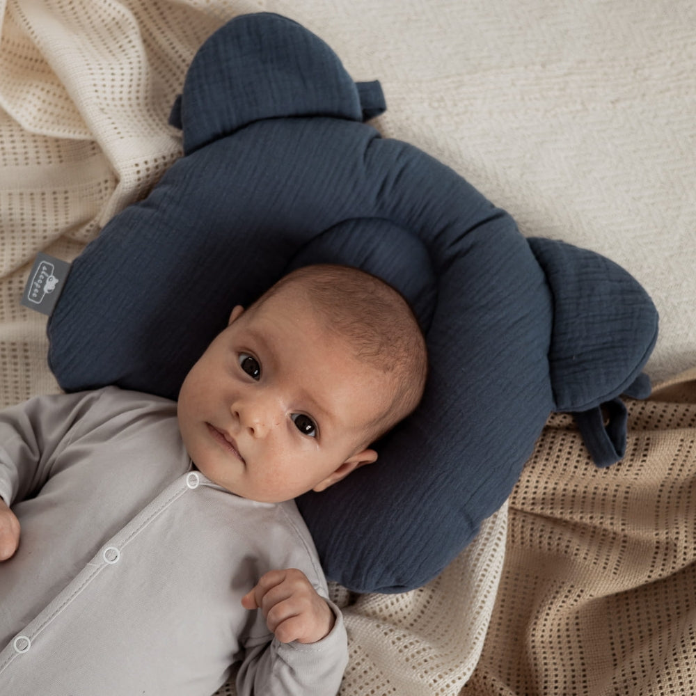 Бебешката възглавница Sleepee е изработена от мек памучен муселин и има формата на главата на мече.