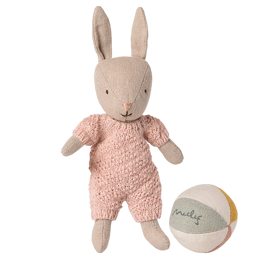 Maileg пясъчно зайче Micro в трикотажни дрехи с аксесоари Rose