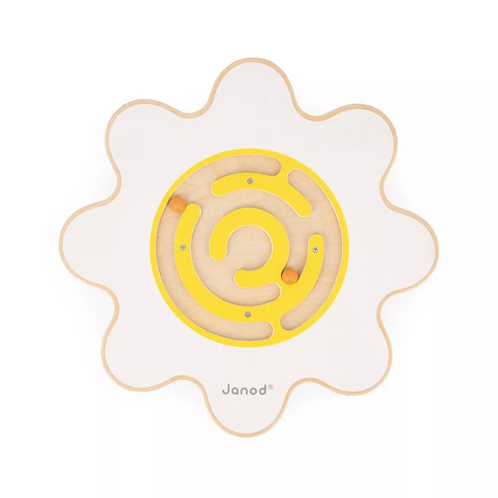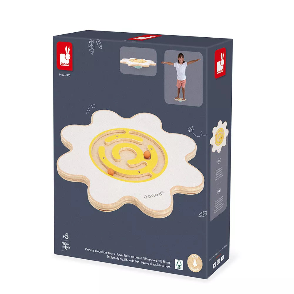 Детската дъска за баланс на Janod с полукръгла основа е с форма на цвете с заоблени ръбове, бели венчелистчета и жълт лабиринт с две топки, които се движат вътре.