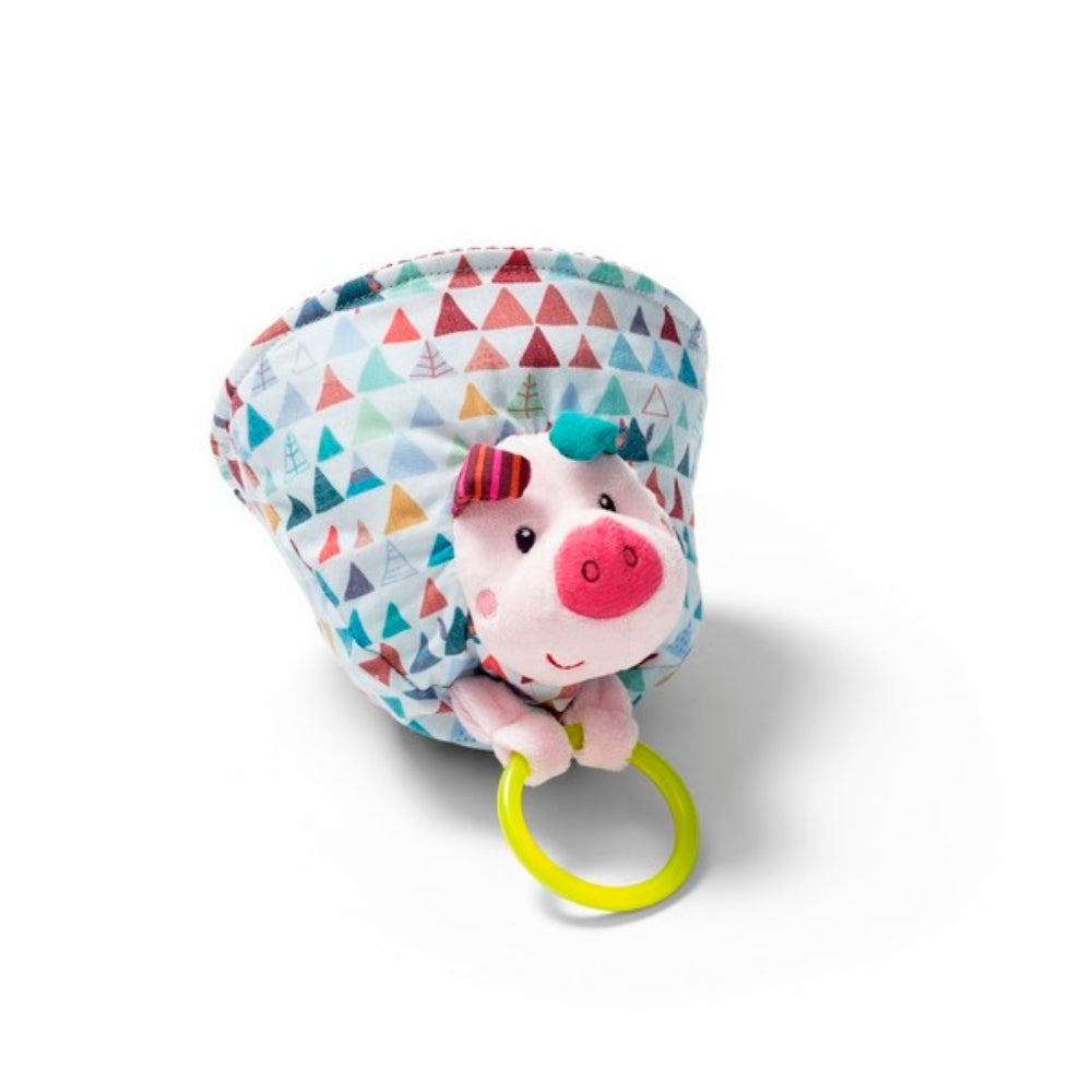 Прасенцето Гастон има прикрепен силиконов пръстен, който служи като гризалка.