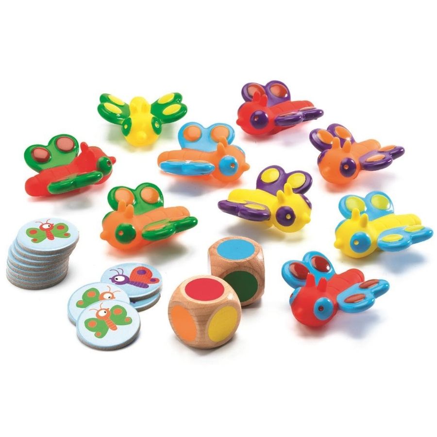- Комплектът включва: 9 гумени пеперуди, 2 зара, 30 жетона за награди