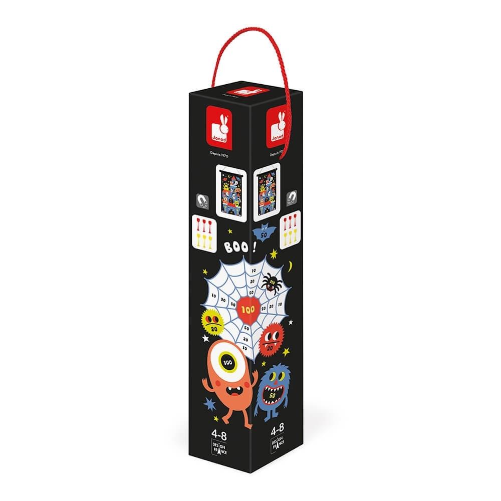 Магнитната игра с дартс „Монстри“ на Janod е страхотно забавление за цялото семейство. Платът на мишената е черен и е украсен с илюстрации на чудовища, паяжина и обитаван от духове замък. Дартсите трябва да се хвърлят към мишената от разстояние, определено от играчите. Печели играчът с най-много точки. Благодарение на тази игра детето упражнява концентрация, сръчност и развива координацията между очите и ръцете.
