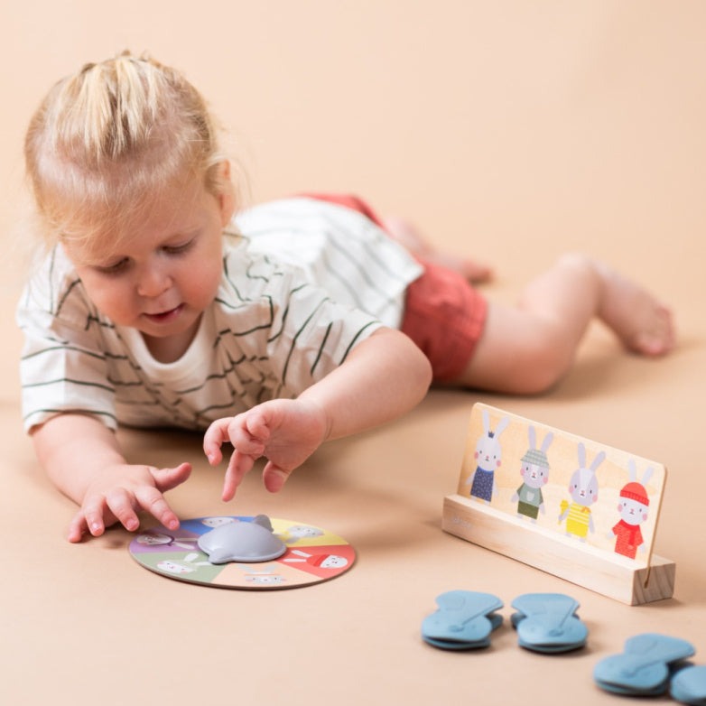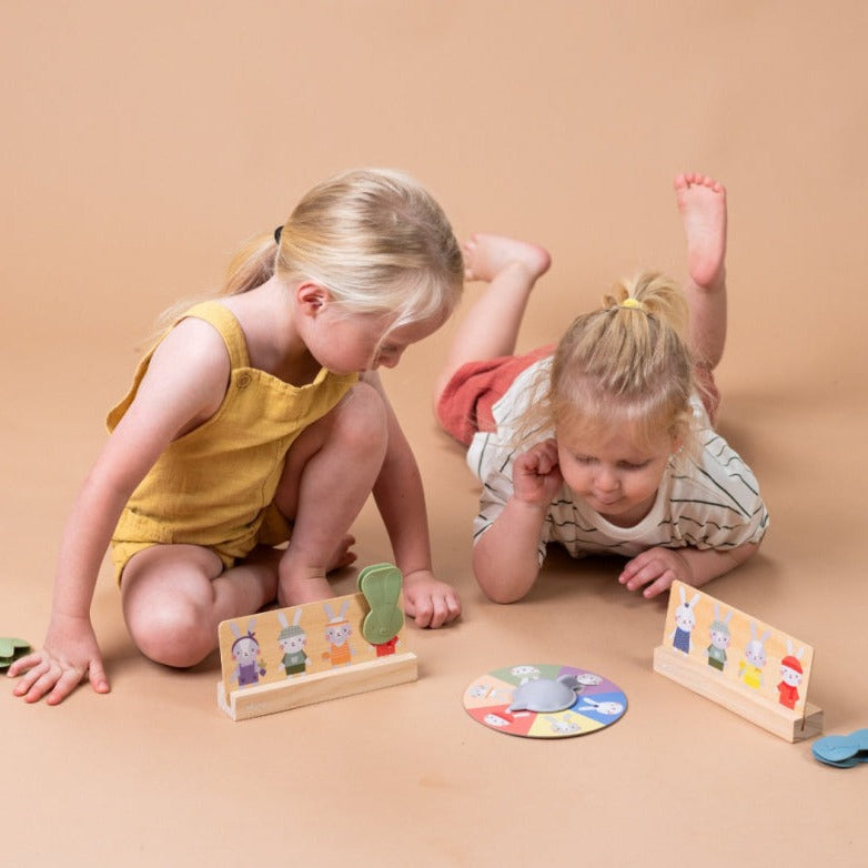 Тази образователна бинго игра на Taf Toys за двама играчи се основава на завъртане на стрелка и поставяне на сладки маркери във формата на зайчета върху дървена дъска според картинката, която се появява.
