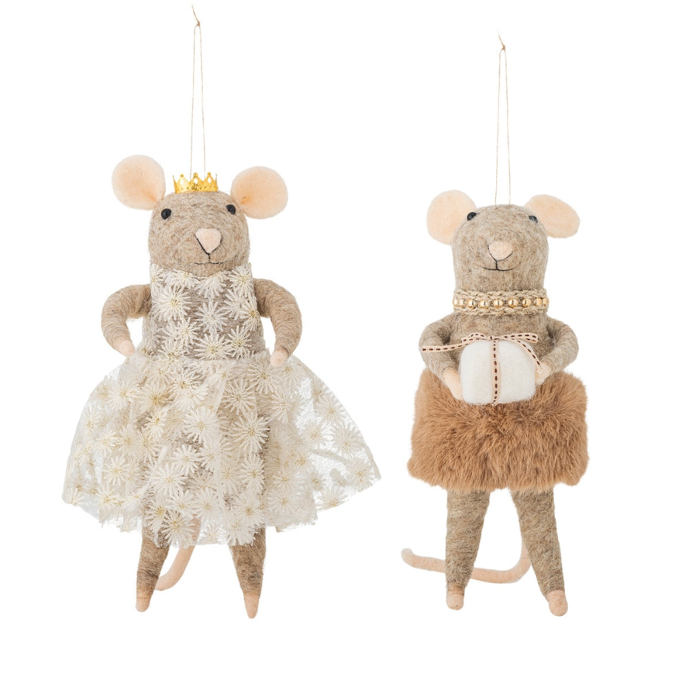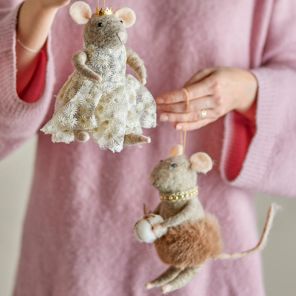 Комплектът от две филцови мишки, изработени от вълна, впечатлява с фините детайли, които придават на украсите специален чар.