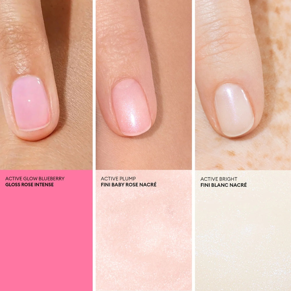 Комплектът включва лак за нокти Active™ Glow Blueberry, който осигурява огледален блясък и съдържа 77,5% съставки от естествен произход.
