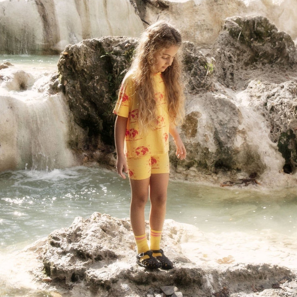 Das Kinder-T-Shirt besticht durch seine intensive gelbe Farbe und den Society-Aufdruck mit Globus- und Sternenmotiv, der dem Styling eine einzigartige Note verleiht.