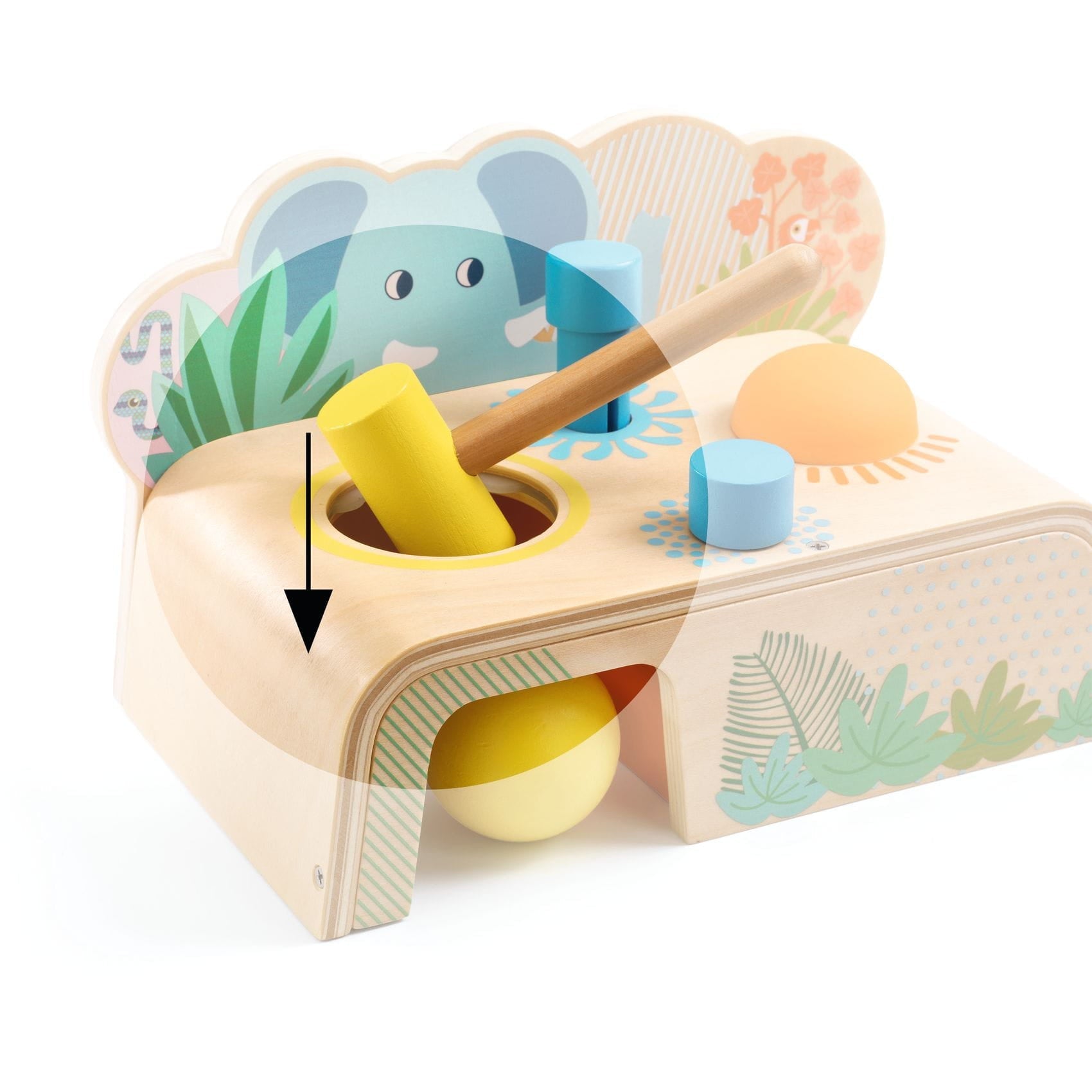 Multitap от Djeco е дървена играчка за ранно развитие, предназначена за деца на възраст 18 месеца и повече.