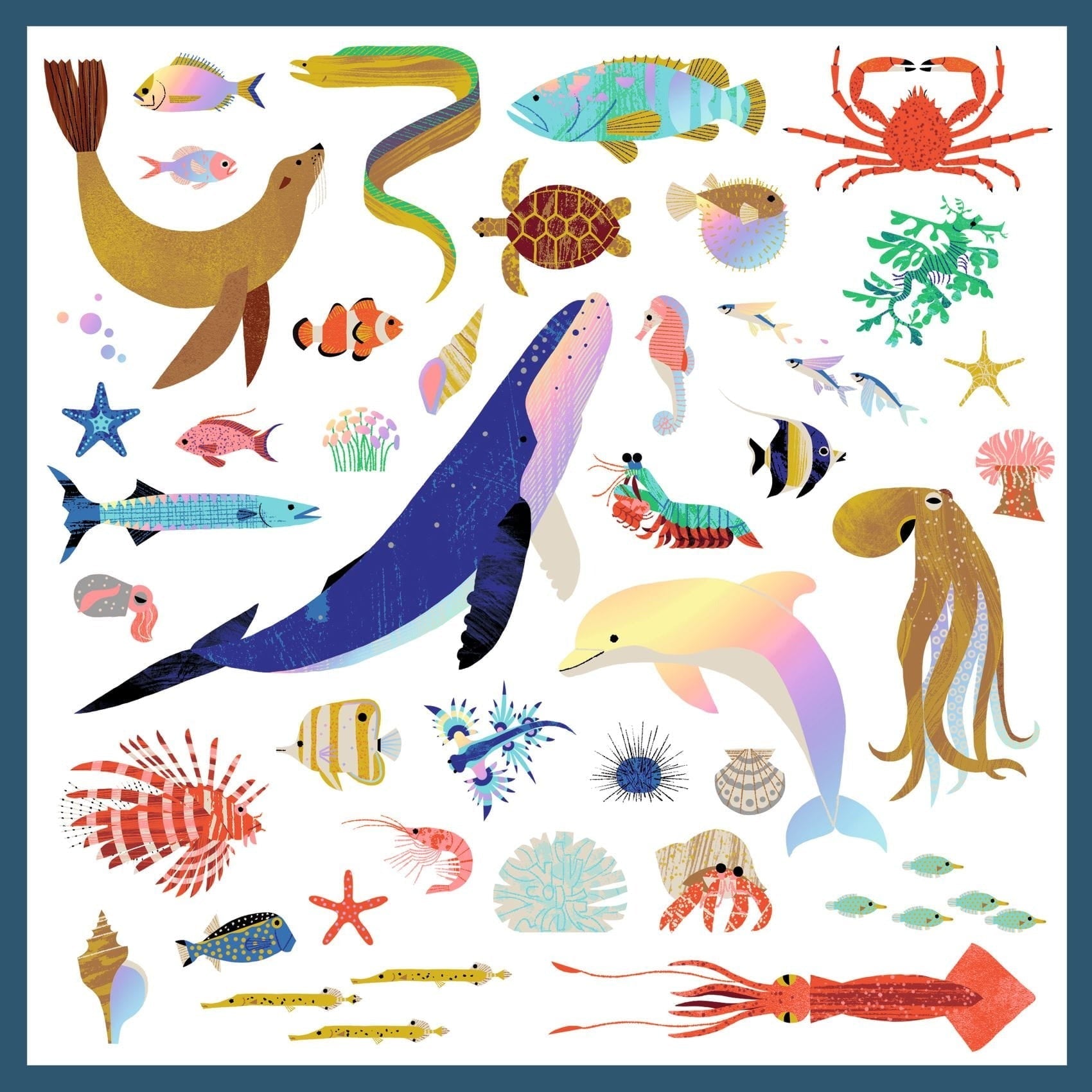 Комплектът съдържа 160 различни стикера с морска тематика, включително животни, които обитават океана, и растения.