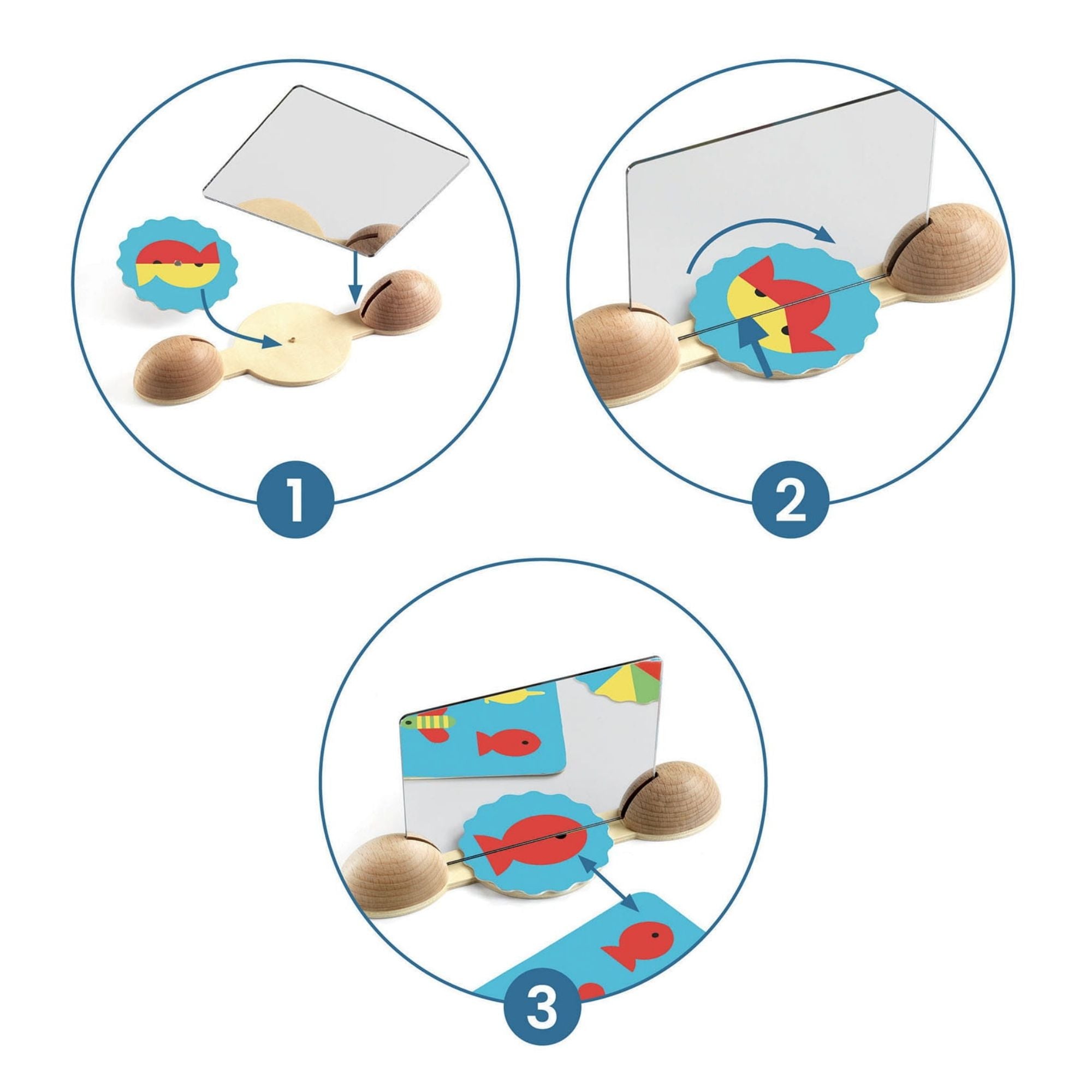 Задачата на децата е да поставят малките изображения под огледалото и да го въртят, докато се образува едно от изображенията на картите.