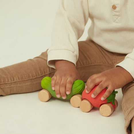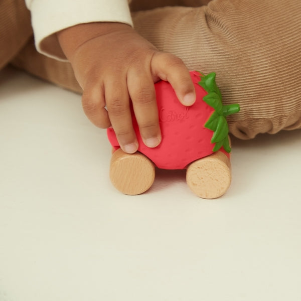 Бебешка кола и бебешка играчка за зъби в едно, Strawberry Sweetie от Oli &, Carol е екологично забавно и изпълнено с радост.
