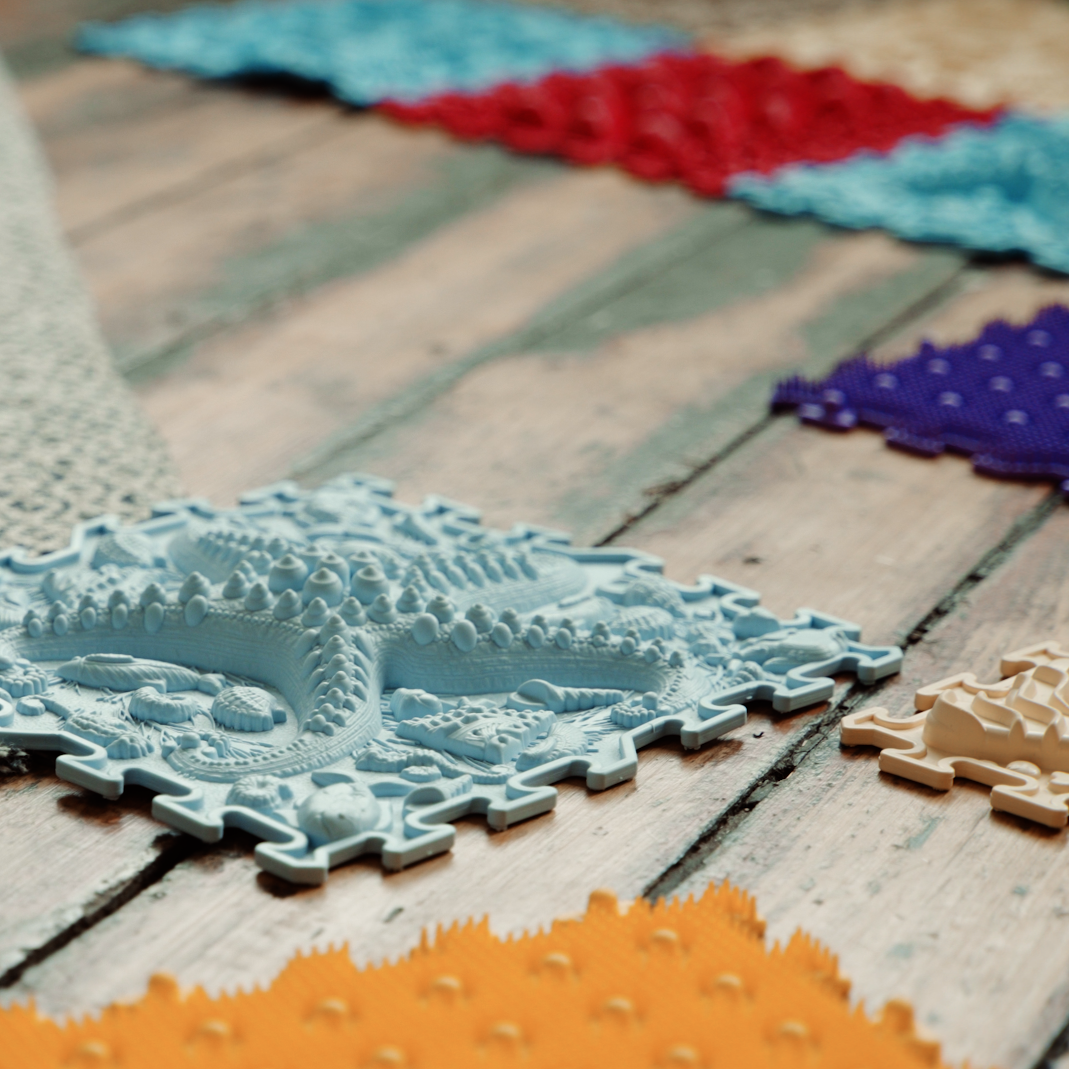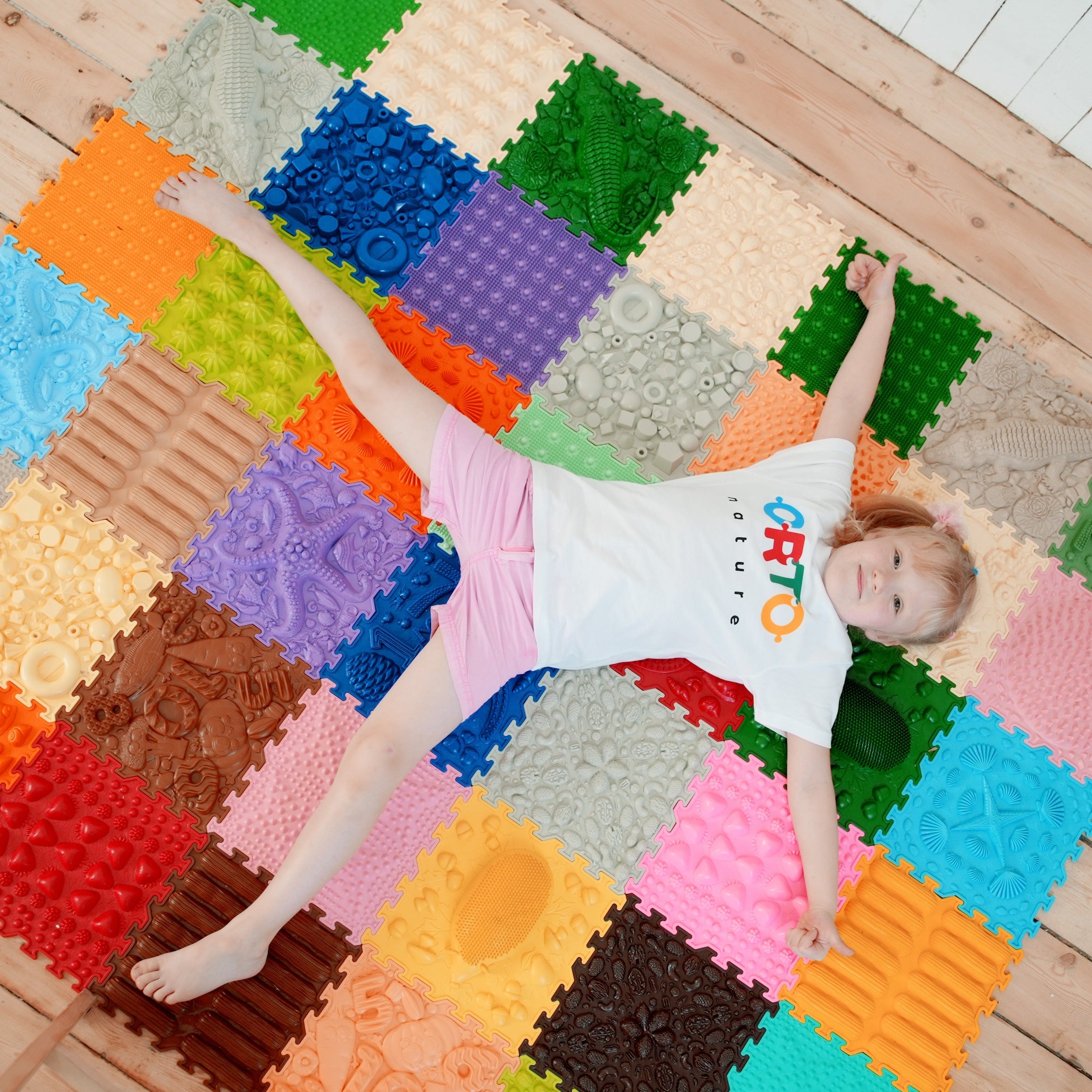 Сензорната постелка от Ortonature предлага широка гама от текстури и цветове, които стимулират въображението, подобряват кръвообращението, помагат за коригиране на плоскостъпието, спомагат за премахване на отоците в краката и подпомагат вестибуларната система.