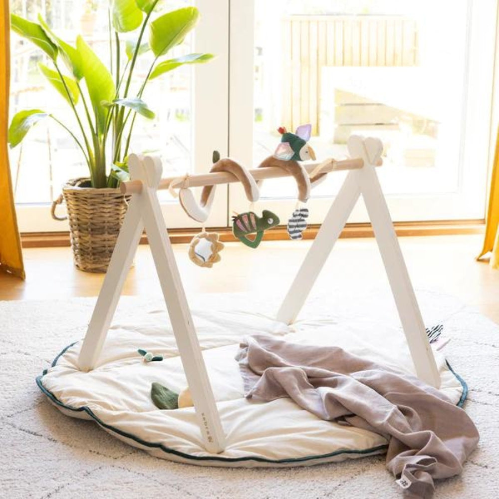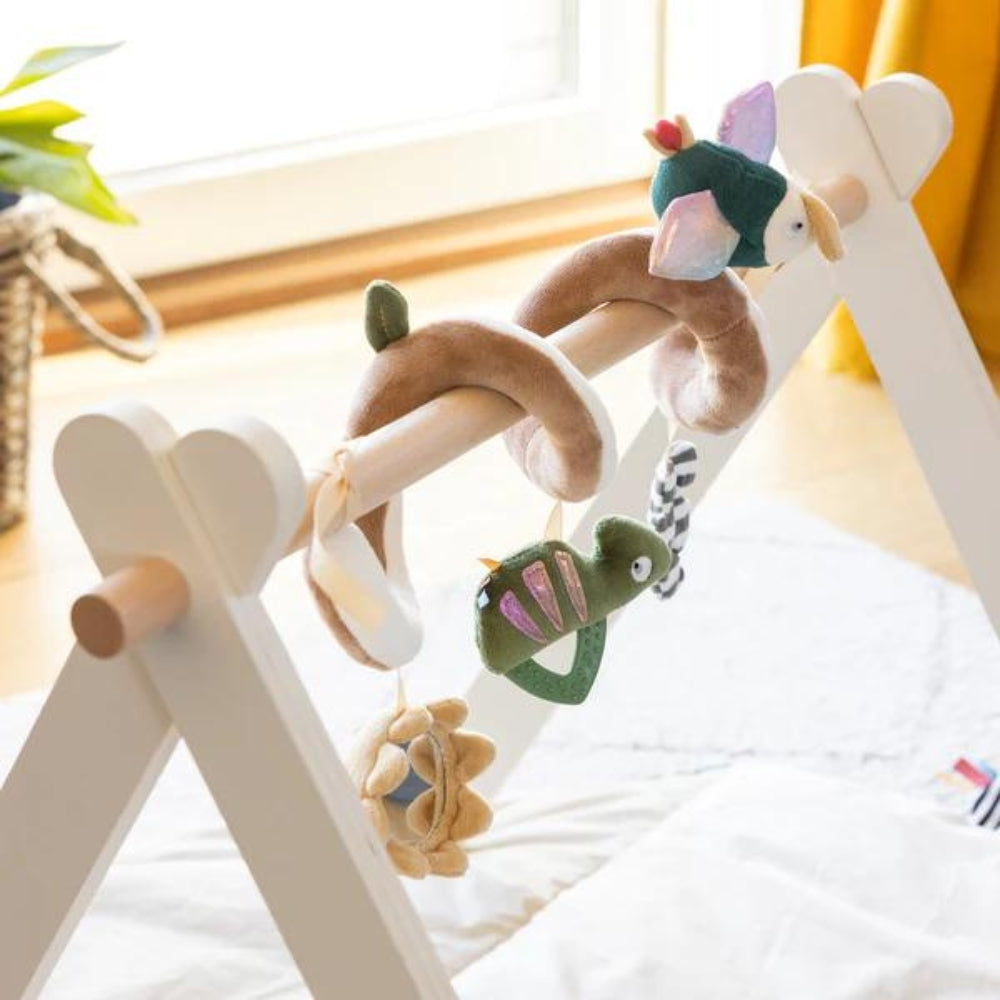 Хамелеонът Карли и туканът Тули са очарователни спътници, седнали един до друг на спиралата за игра, с ярки цветове и очарователни сензорни листенца.