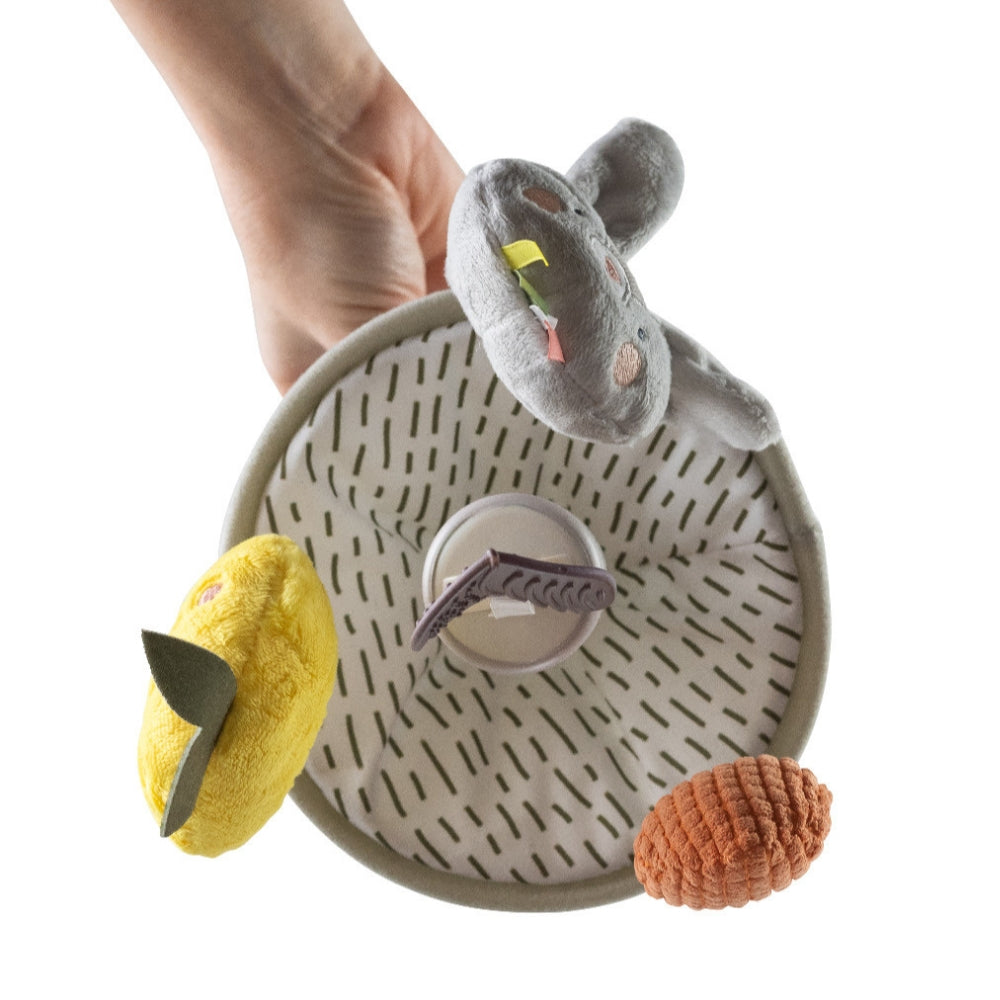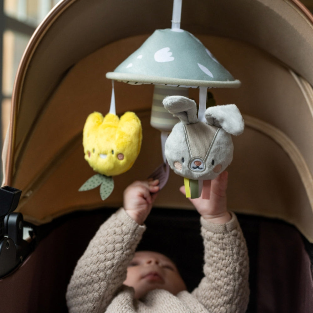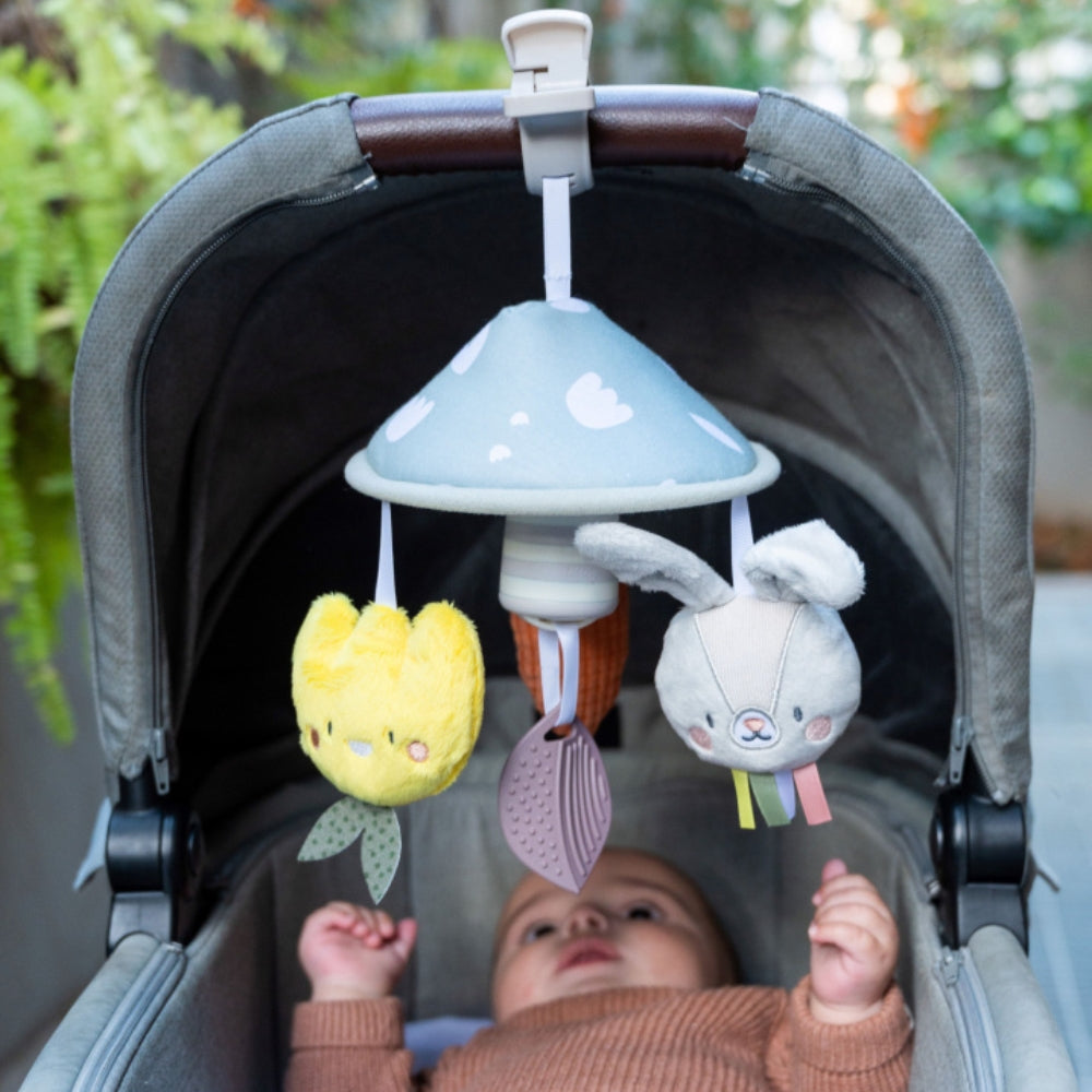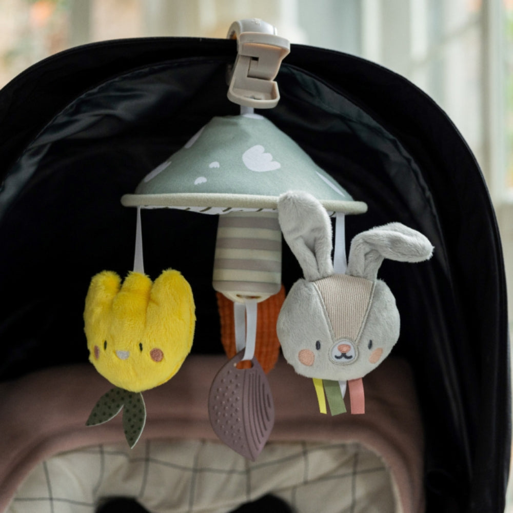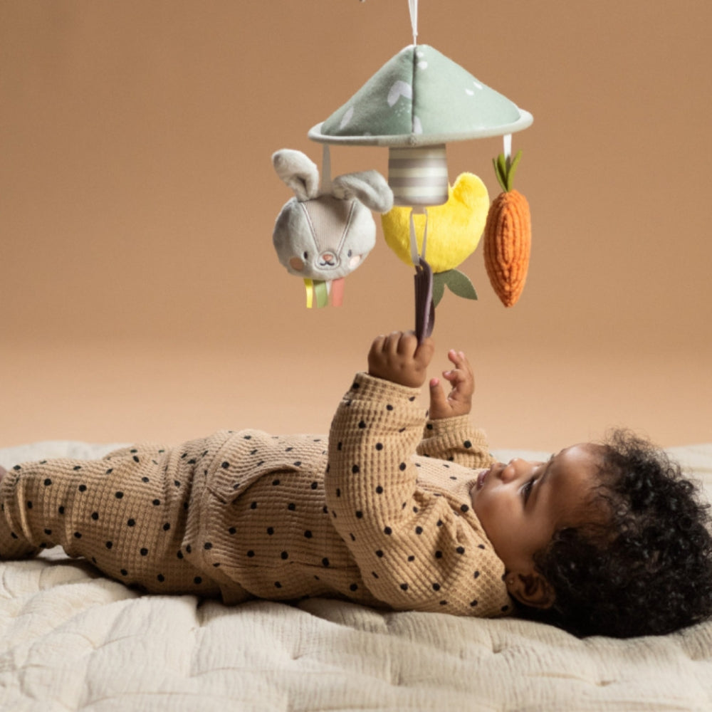 Тя включва различни елементи, като например очарователното зайче Rylee, окачени моркови и лалета, които висят от зеления навес и насърчават бебетата да развиват уменията си за визуално проследяване.