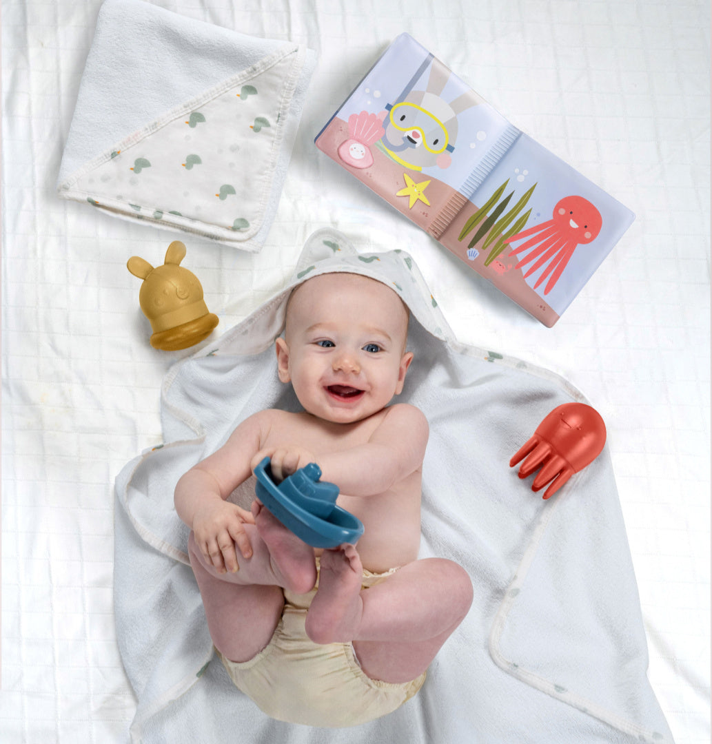Комплектът за баня на Taf Toys помага за създаването на приятна, структурирана рутина, която дава на бебето чувство за сигурност и превръща банята в дългоочакван момент от деня.