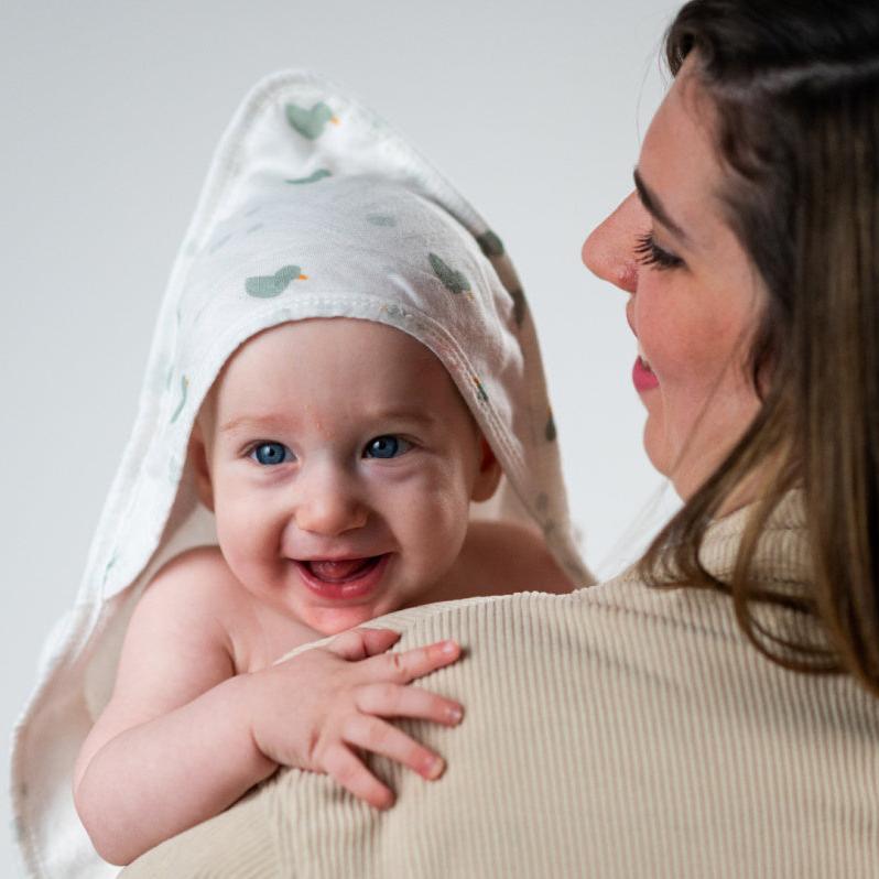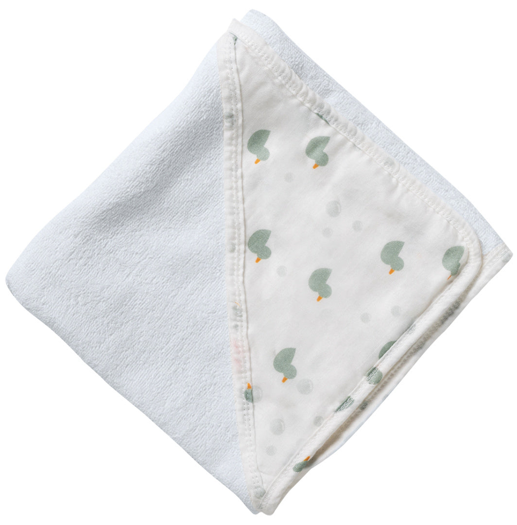 Той включва уютна кърпа с качулка, с която да увивате бебето след всяко къпане, две забавни силиконови играчки за пръскане на вода и очарователна играчка във формата на лодка за безкрайни игри с вода.