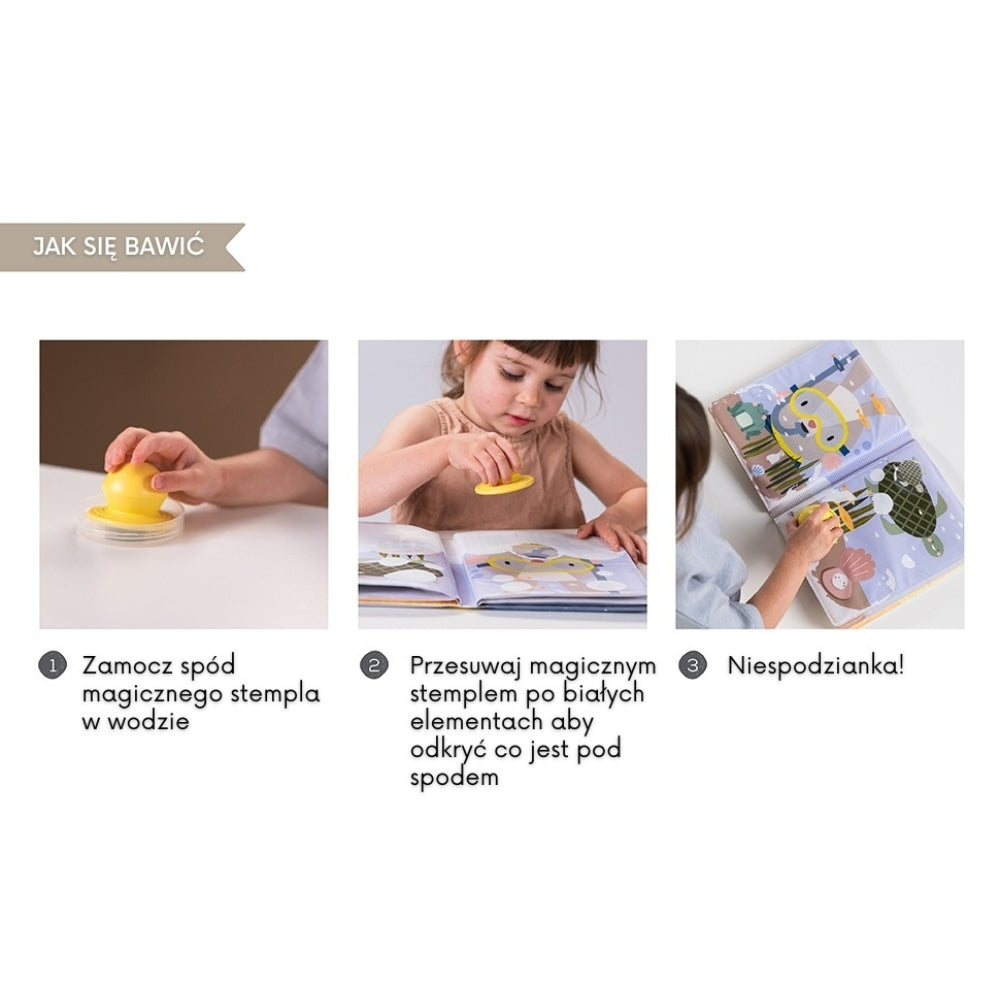 Вълшебната книжка с печат е уникално предложение за малките изследователи – нужно е само малко вода, за да се появят скритите цветни илюстрации на страниците.