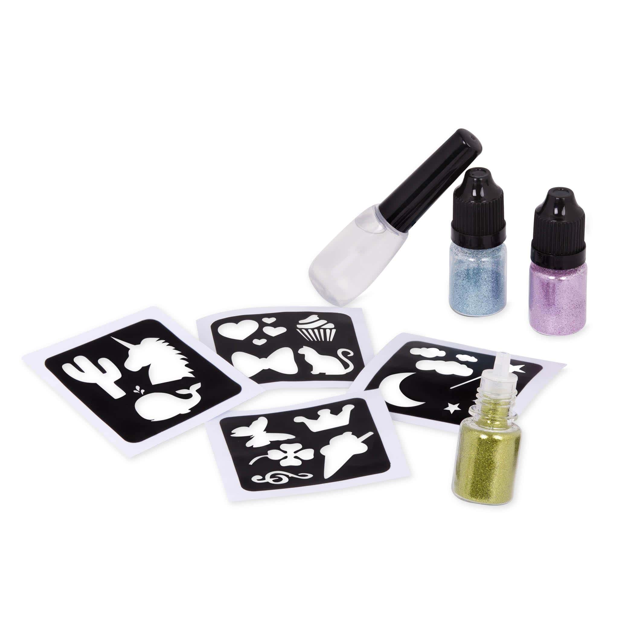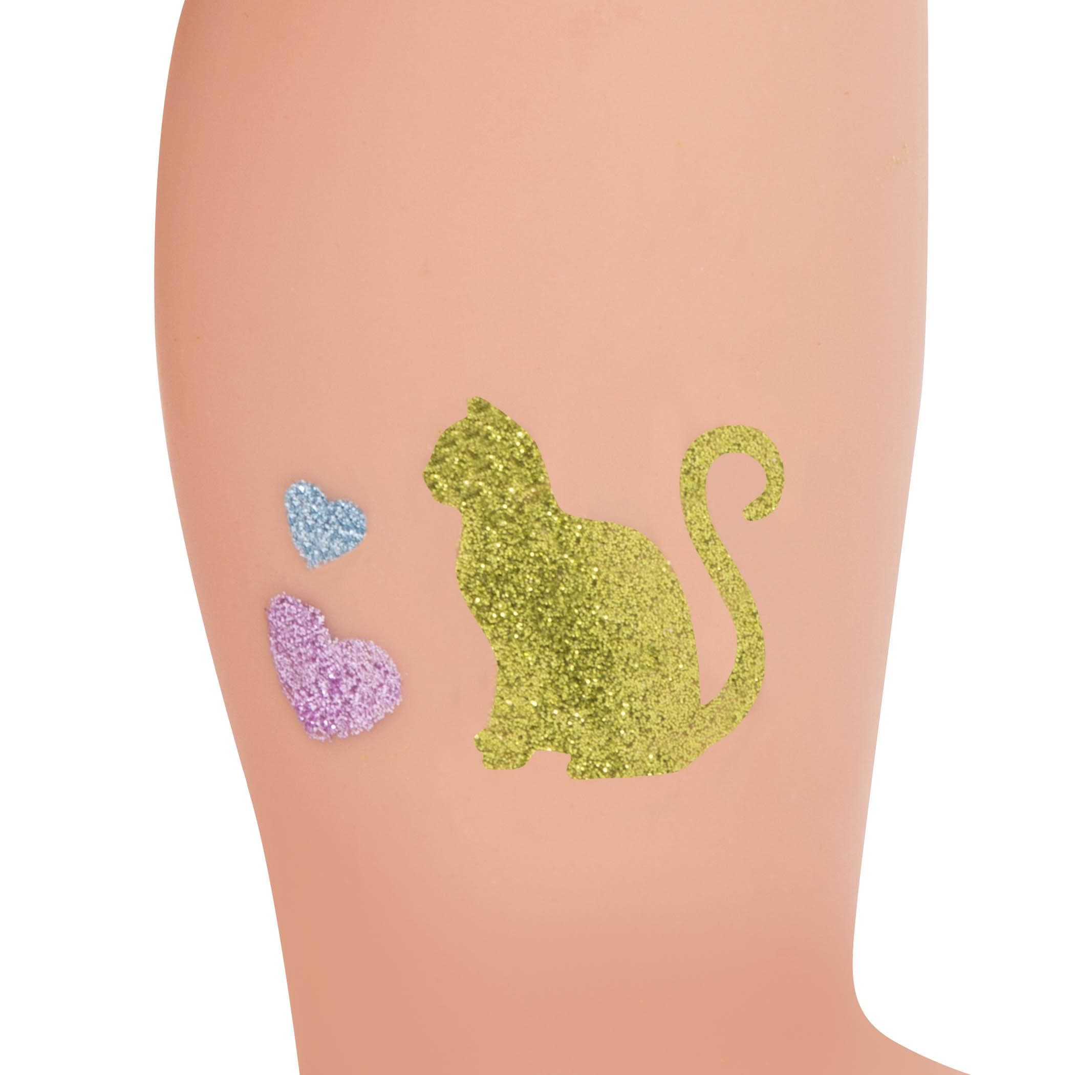 - Комплектът включва: кукла, рокля, фиба за коса с панделка, бельо, обувки, 4 шаблона за многократна употреба за създаване на татуировки, блестящи частици в 3 цвята, бутилка лепило, инструкции за употреба.
