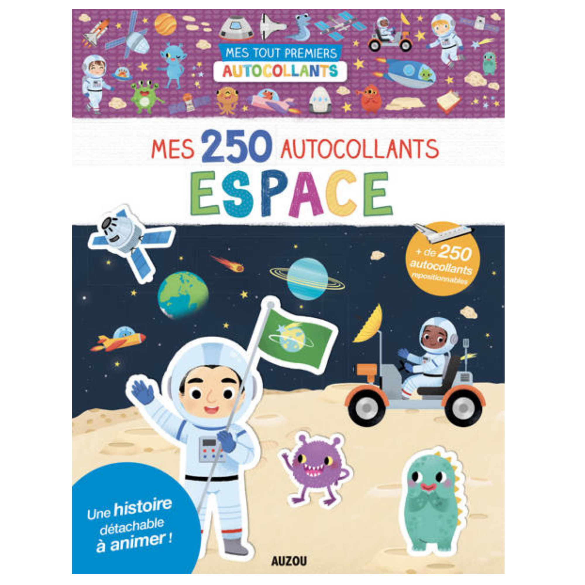 „В космоса“ е поредната книга със стикери от Auzou, посветена на космическите експедиции.