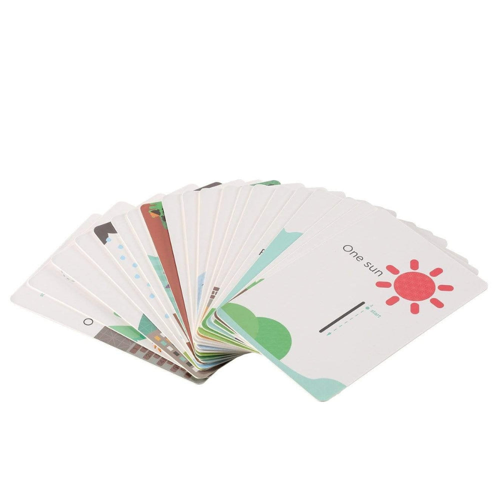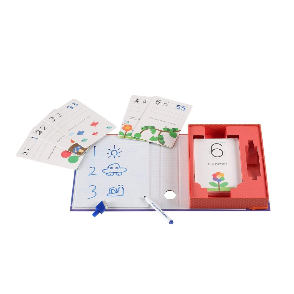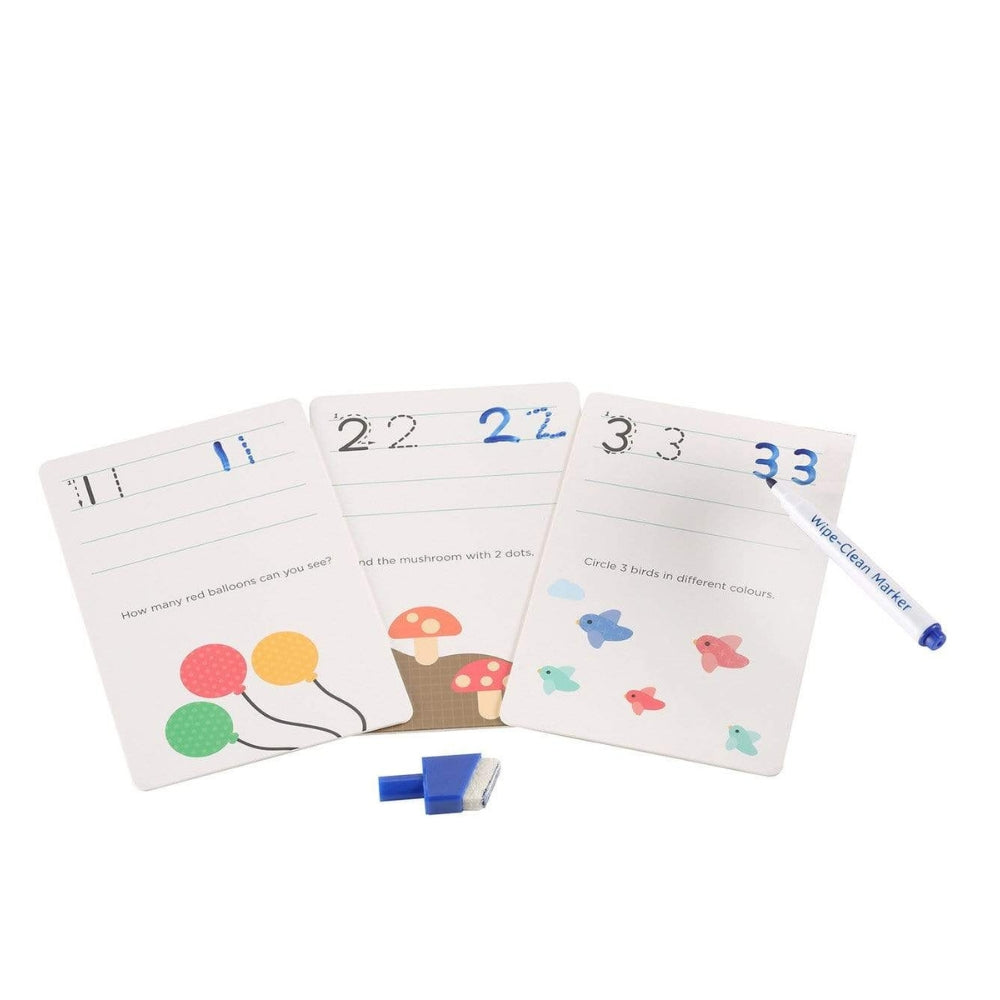 Комплектът включва 20 лесни за почистване карти с числа и прости английски пъзели, както и 1 изтриваем маркер.