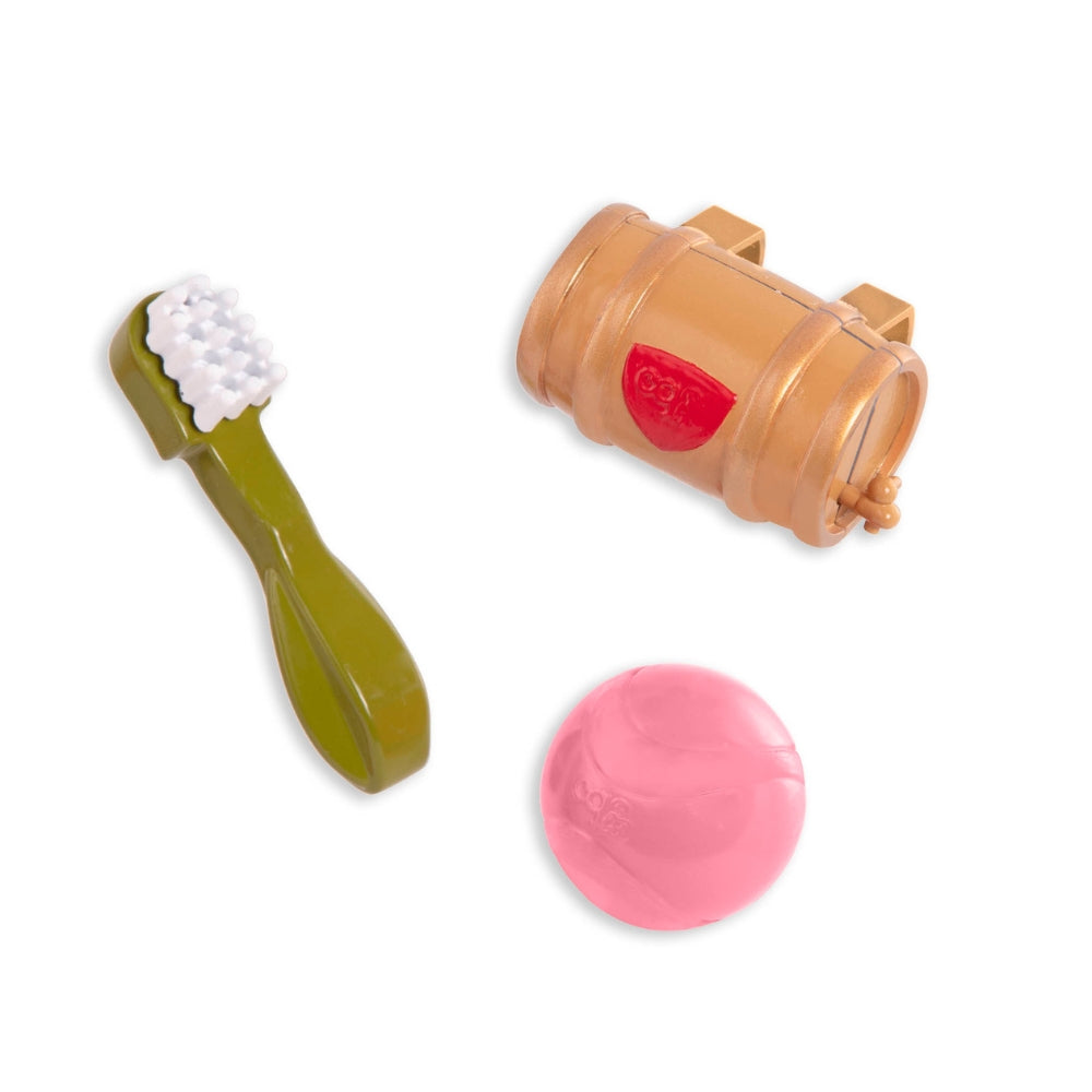 - Комплектът включва: кукла 46 см, плетена рокля с висока яка, жилетка, бельо, ботуши, кученце, топка, четка за зъби за кученце, декоративна бъчва, прикачаща се каишка, нашийник и повод