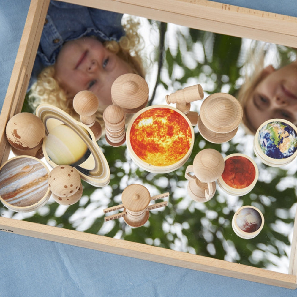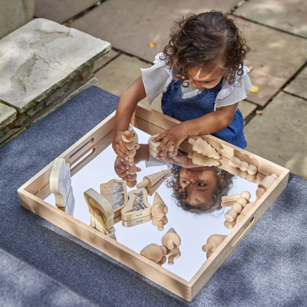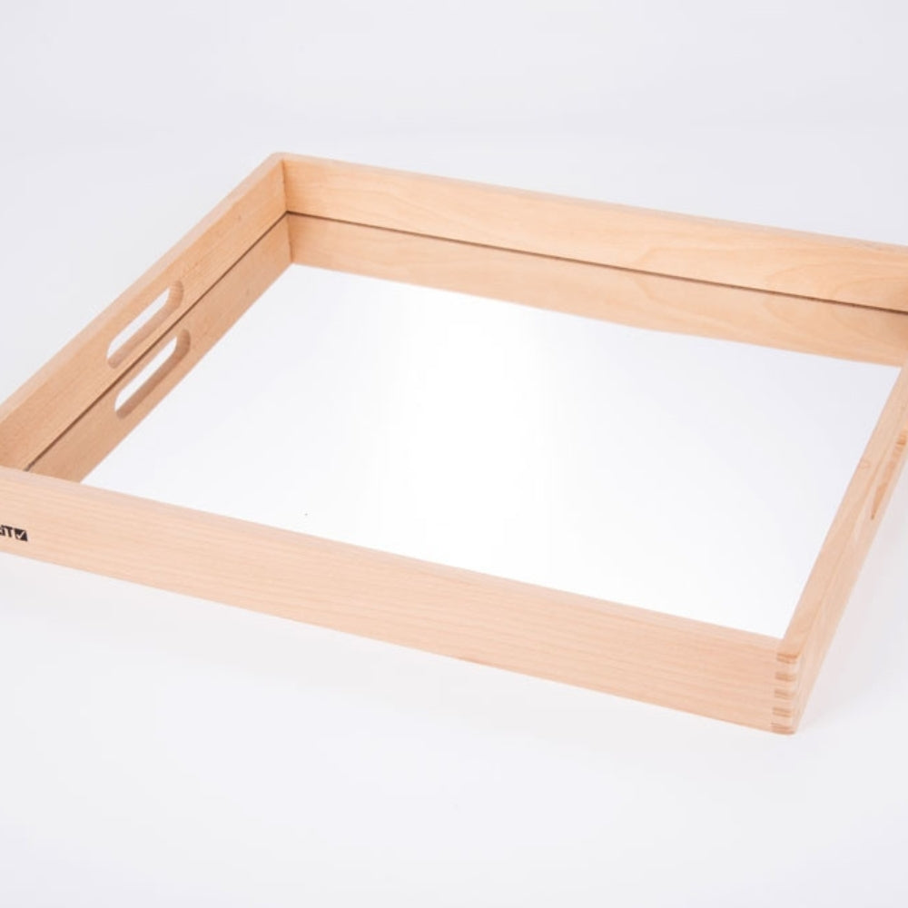 Тавата за огледало за деца, изработена от масивно буково дърво, е идеална за обучение за отраженията и ефектите на огледалото, за внимателно разглеждане на интересни предмети, за използване в игри, стимулиращи въображението, и за създаване на малки светове.