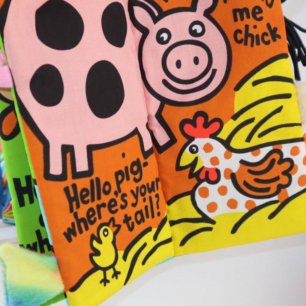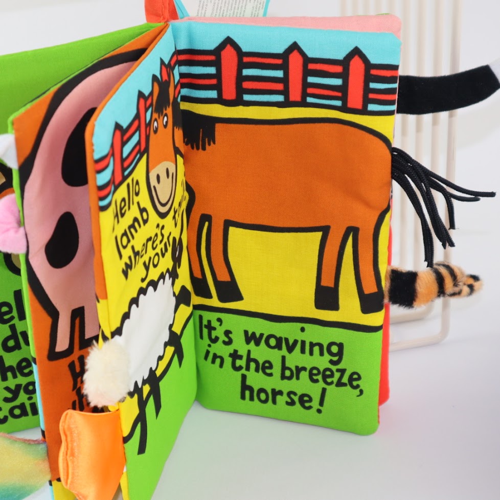 Сензорната книжка „Фермата“ от Jellycat ви позволява да разпознавате различните животни по опашките им