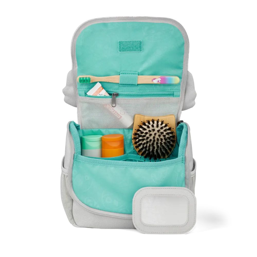 Двата еластични странични джоба от мрежа и функционалната верижка за прибори правят детската козметична чантичка идеална за почивки, детска градина или уикенд екскурзии.