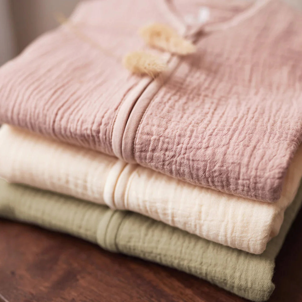 Изработен от мек, дишащ муслин, идеален за лятото.