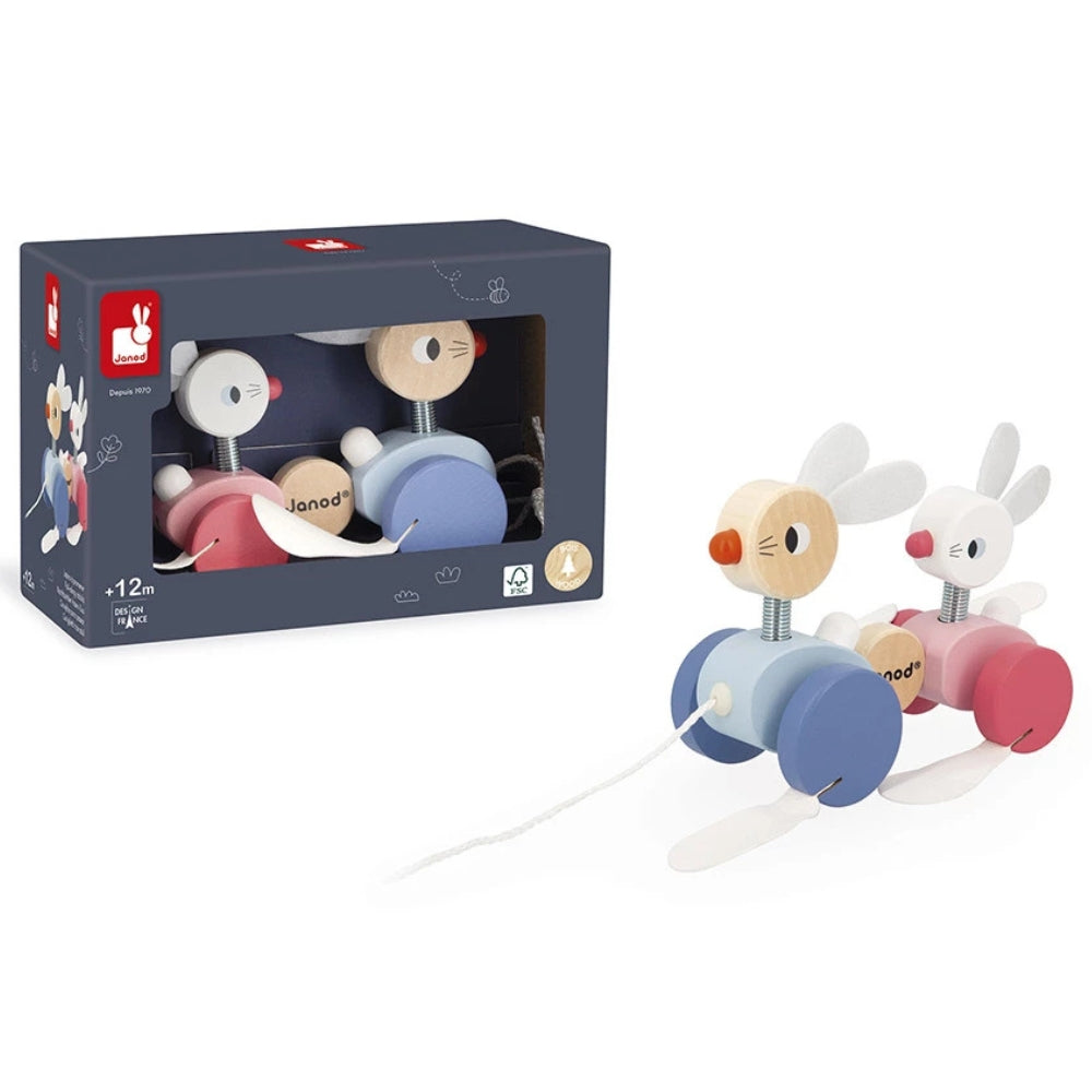 Играчката за дърпане на Janod е очарователно семейство зайчета, което детето може да вземе навсякъде със себе си.