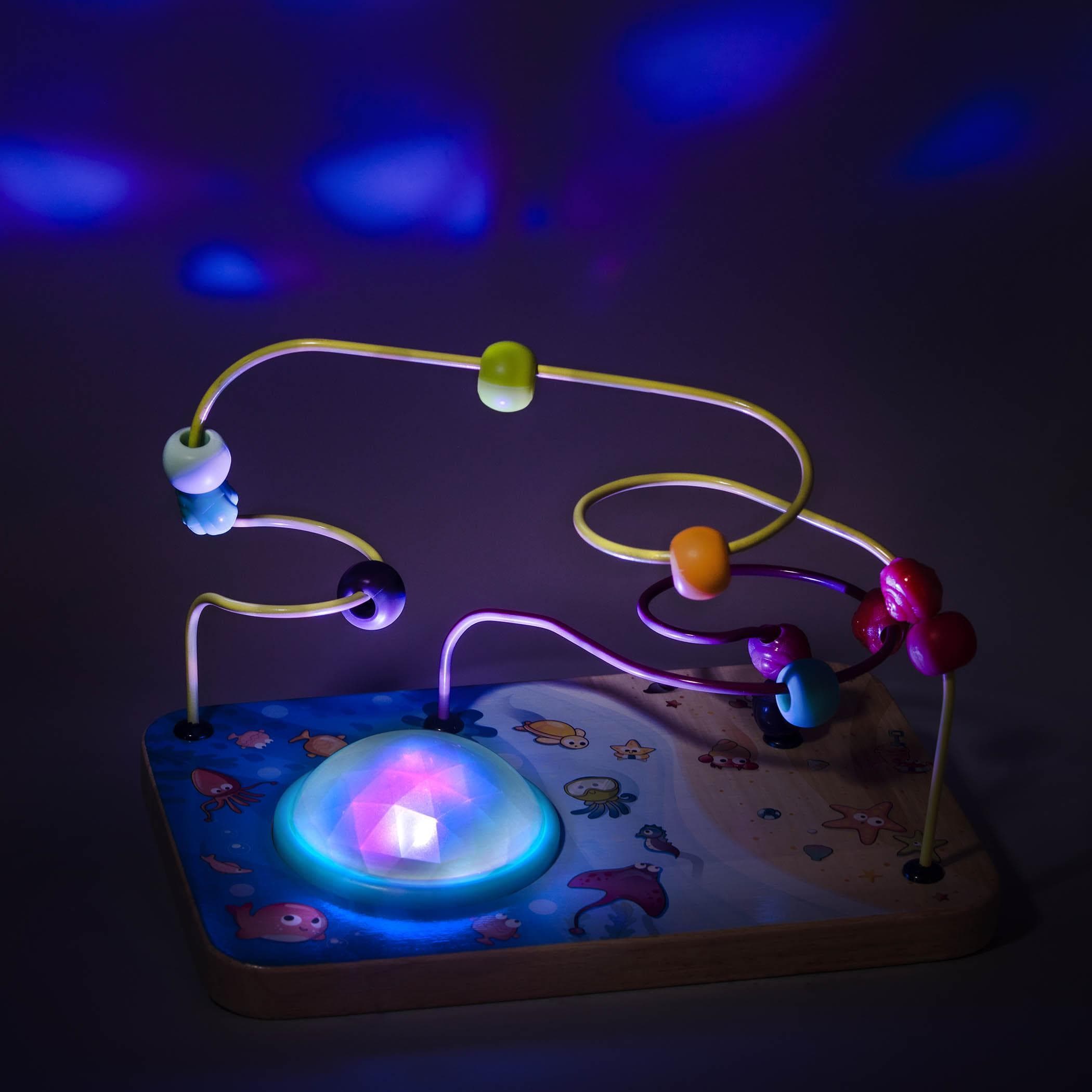 Лабиринт за манипулация със светеща топка, многоцветни мъниста върху дървена основа със светлинни ефекти.