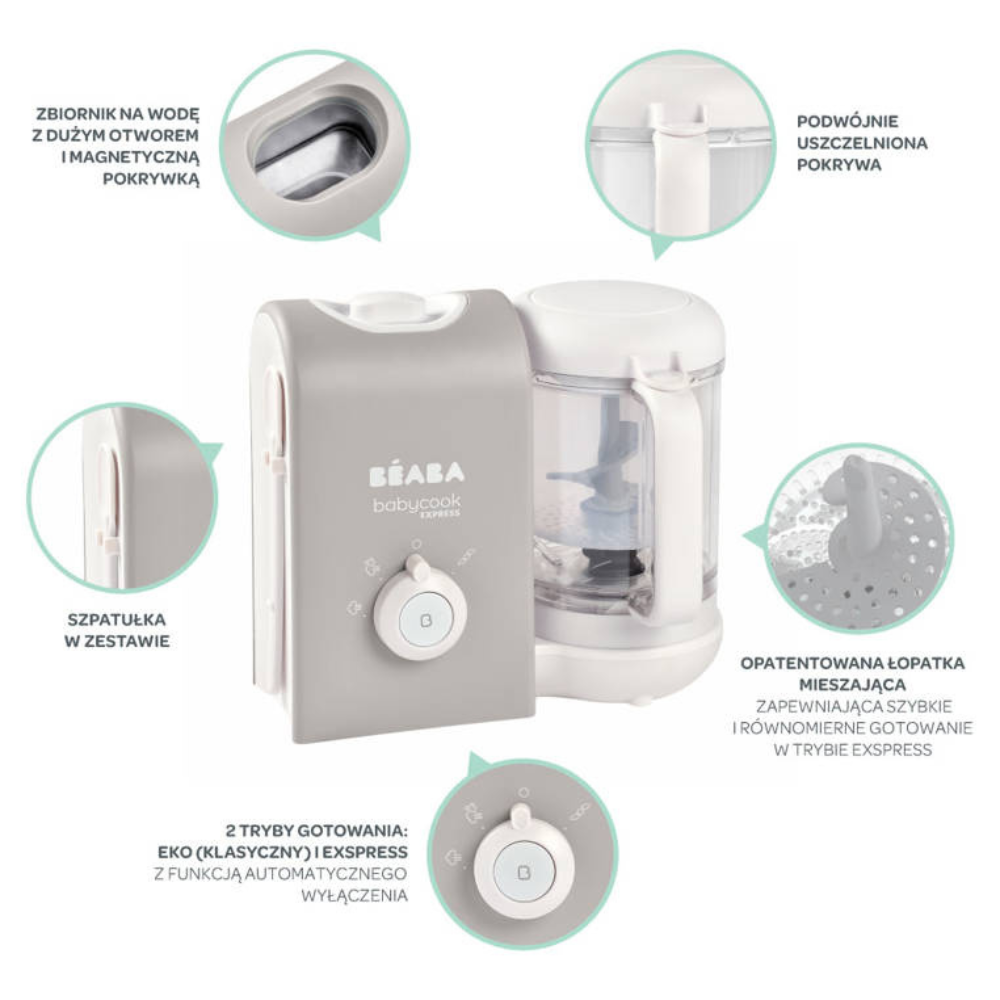 Beaba babycook се предлага със специално оформена лопатка за разбъркване с отвори, както и с двойно уплътнение на капака, което улеснява равномерното и бързо готвене на пара в режим Express.