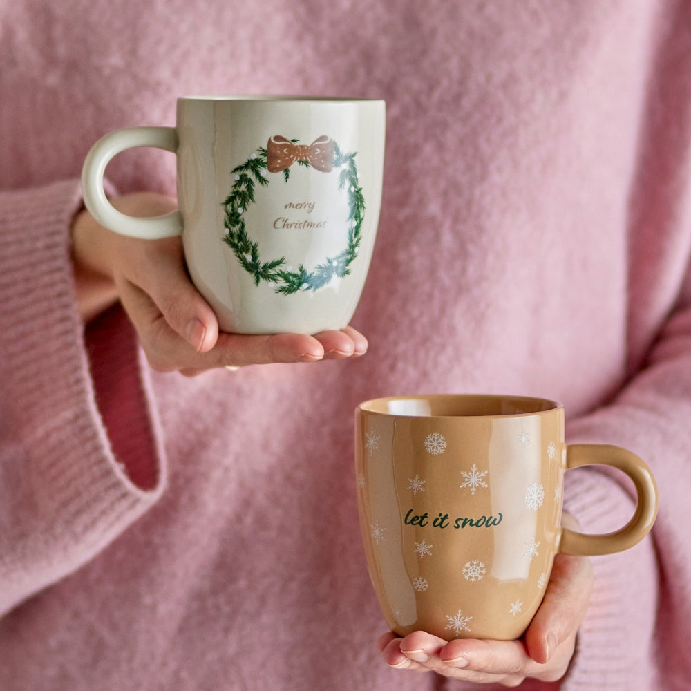 Комплектът включва две чаши за кафе от каменна керамика, украсени с очарователни мотиви – едната с надпис „Let it snow“, обграден от снежинки, а другата с класическа гирлянда и надпис „Merry Christmas“.