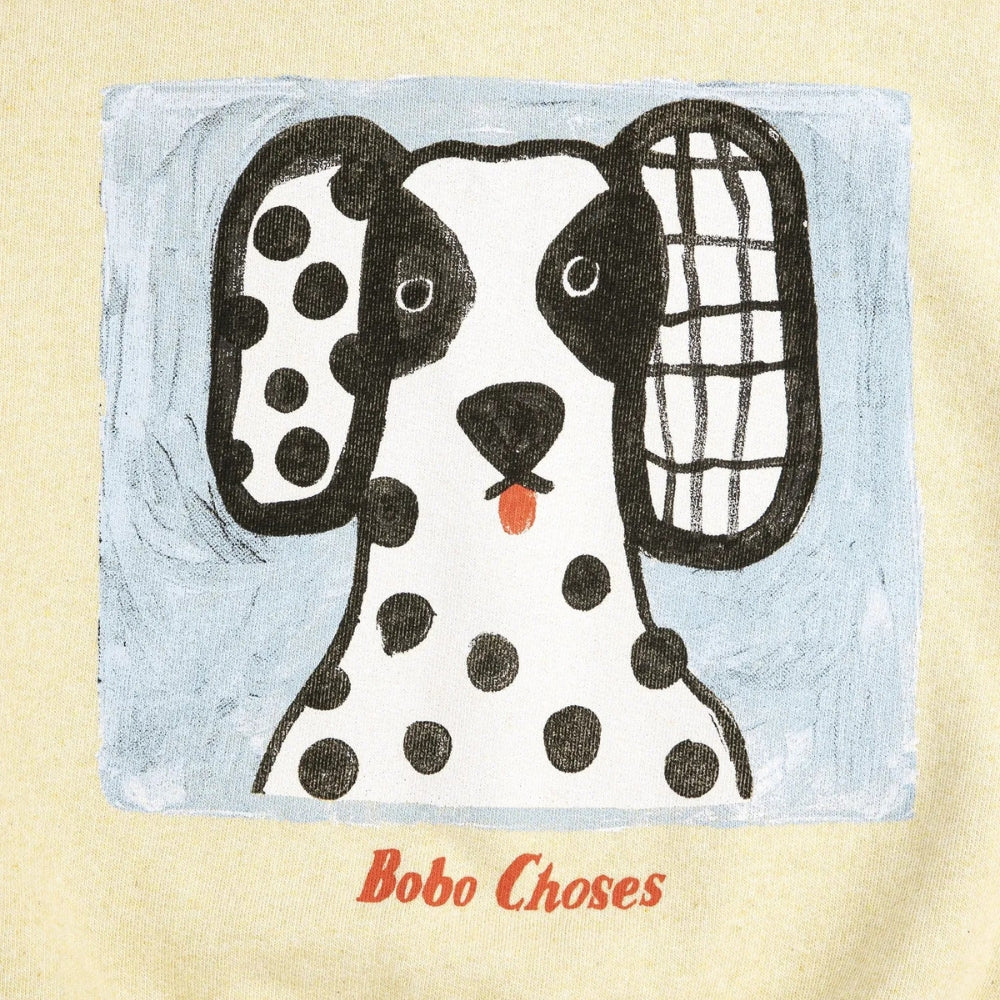 Свободната, класическа кройка дава на детето ви свобода на движение, а светлият, деликатен цвят в комбинация с симпатичния мотив с куче придават на цялостния вид вечен характер.