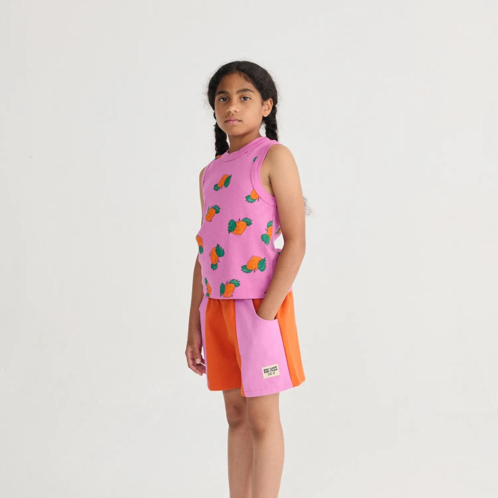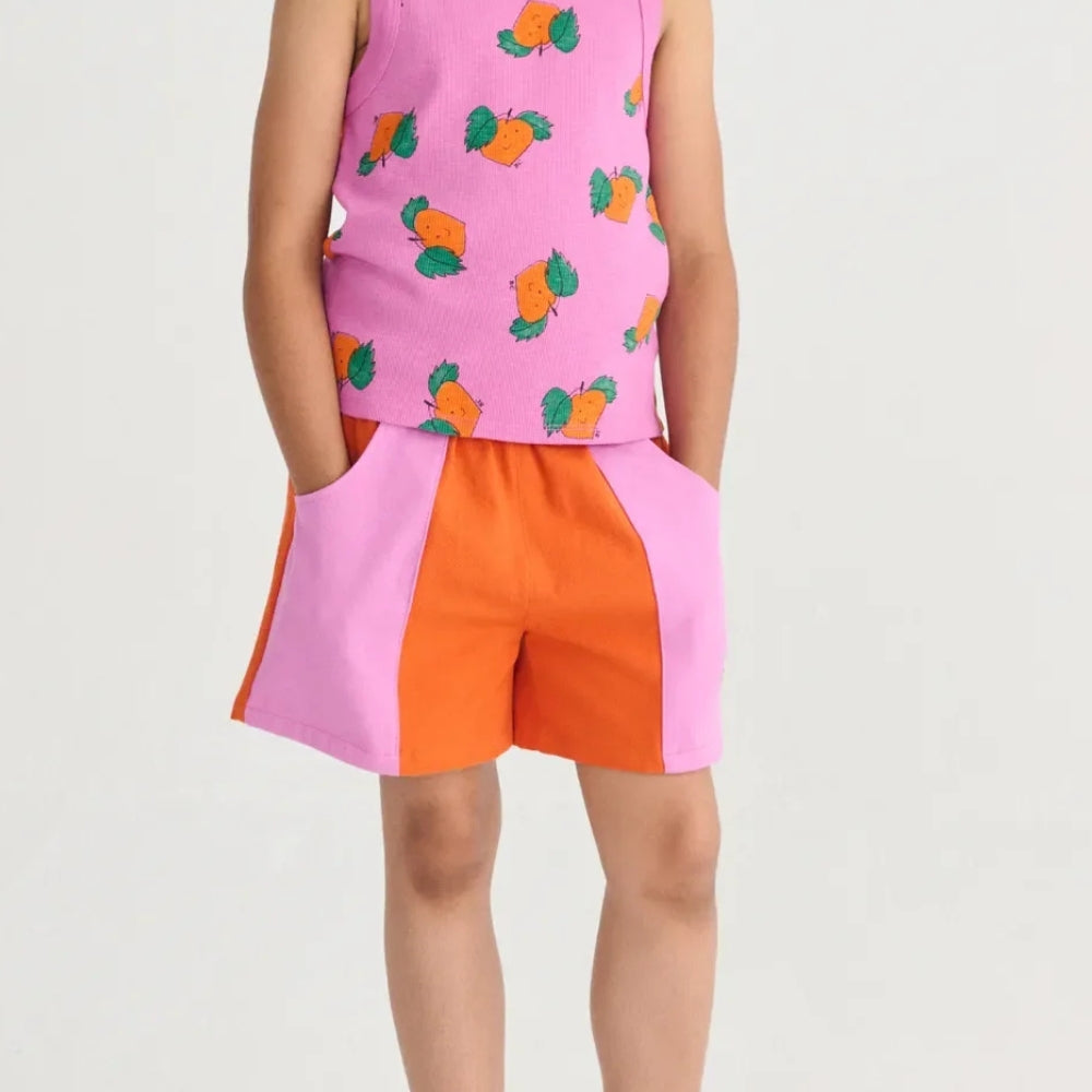 Розово-оранжевата цветова гама е привлекателна и се вписва перфектно в летния стил, а кройката по мярка прави шортите за момичета идеално подходящи за фигурата на детето.