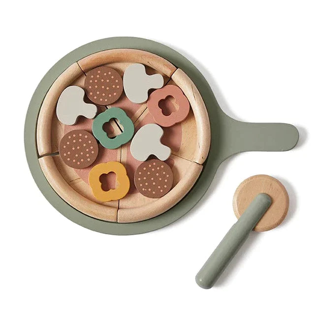 Тази дървена пица, комплект с тава, нож и гарнитури, вдъхновява ролеви игри в детската кухня.