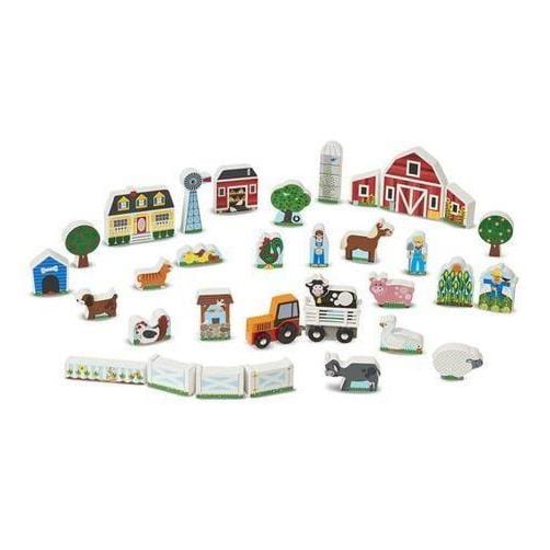 Комплектът „Ферма“ на Melissa and Doug включва дървени фигурки като дървета, фигури, сгради и животни.