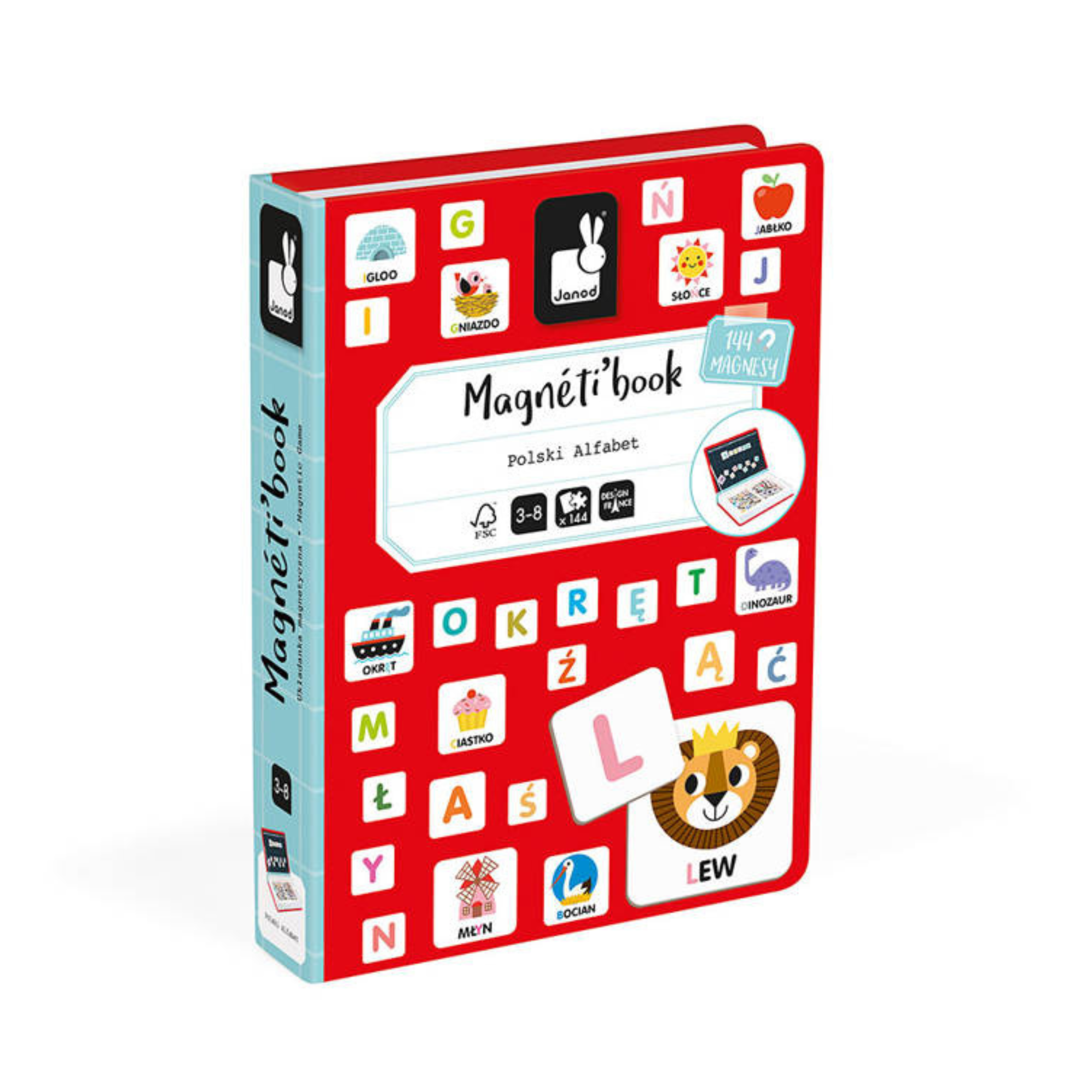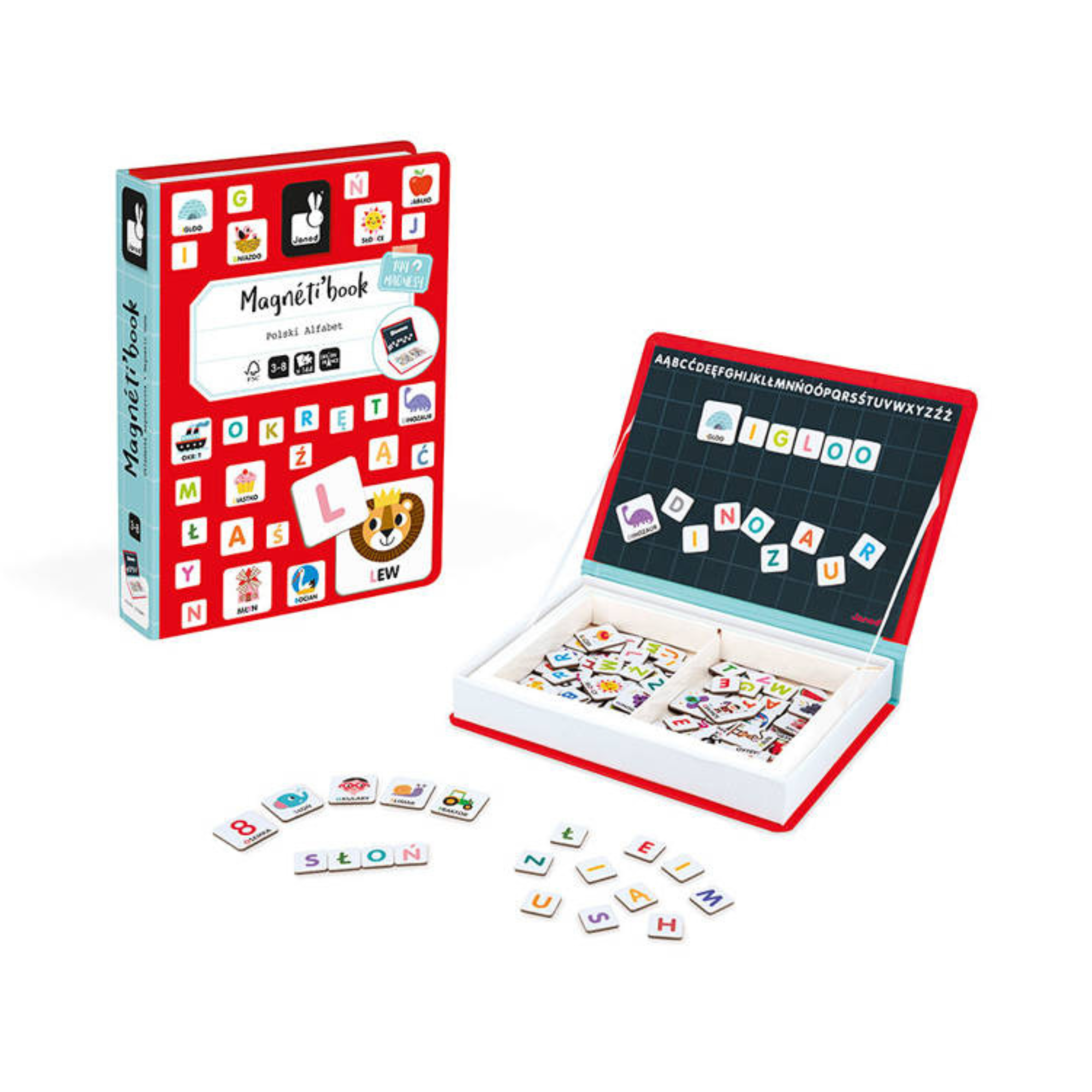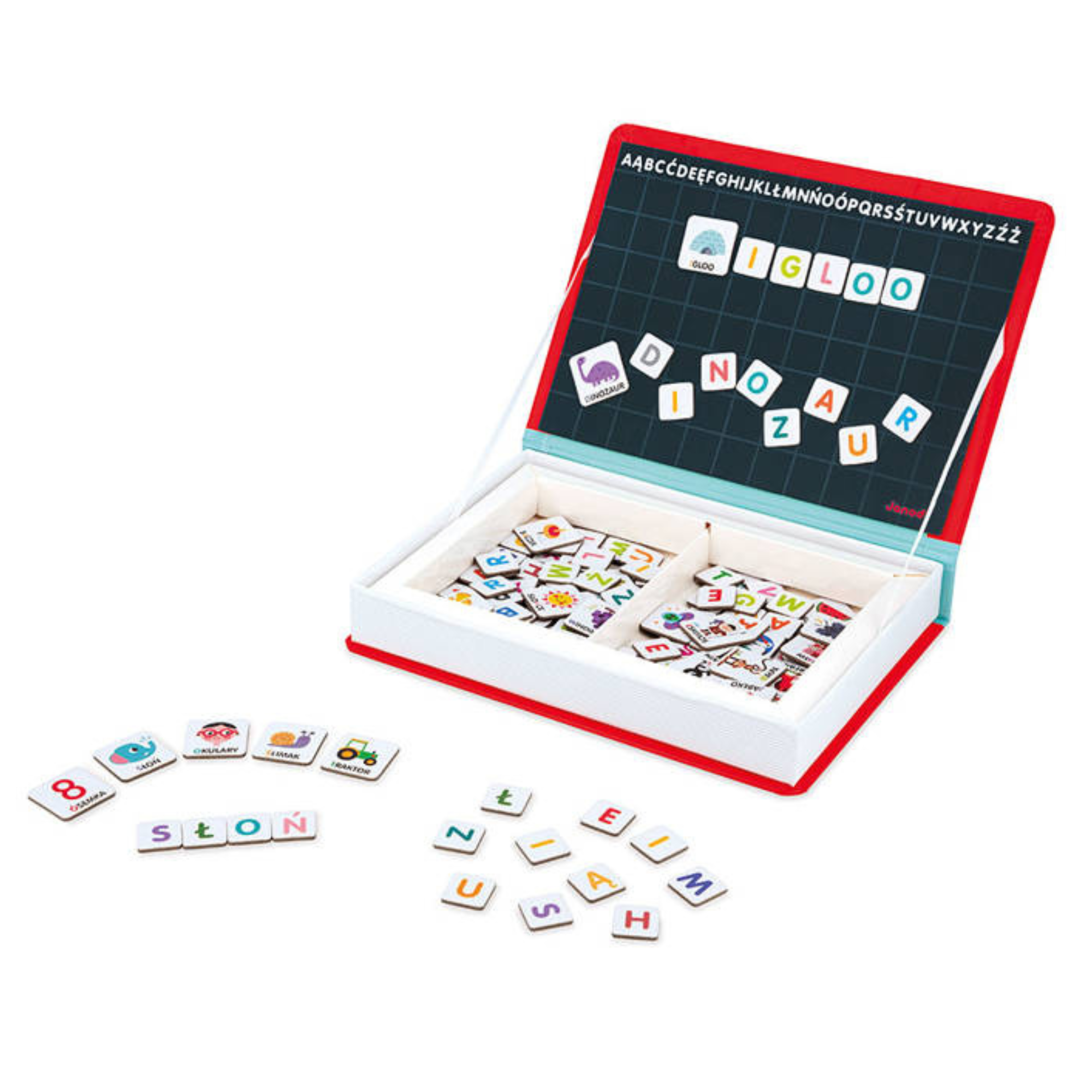 Магнитният пъзел с азбука на Janod се състои от 144 магнита, включително 109 магнита с буквите от полската азбука и 35 по-големи магнита с цветни картинки и думи, които ги описват.
