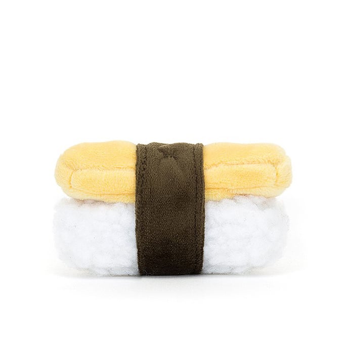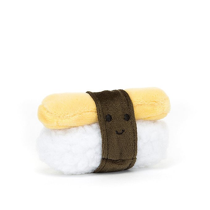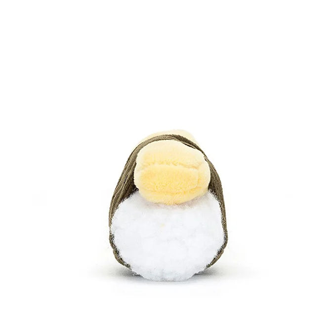 Das Jellycat Baby-Maskottchen hat ein weiches weißes Fell, das in dunkelgrünes Nori eingewickelt ist, ein lächelndes Gesicht, einen weichen Bauch und einen Hut in Form eines Eier-Omeletts.