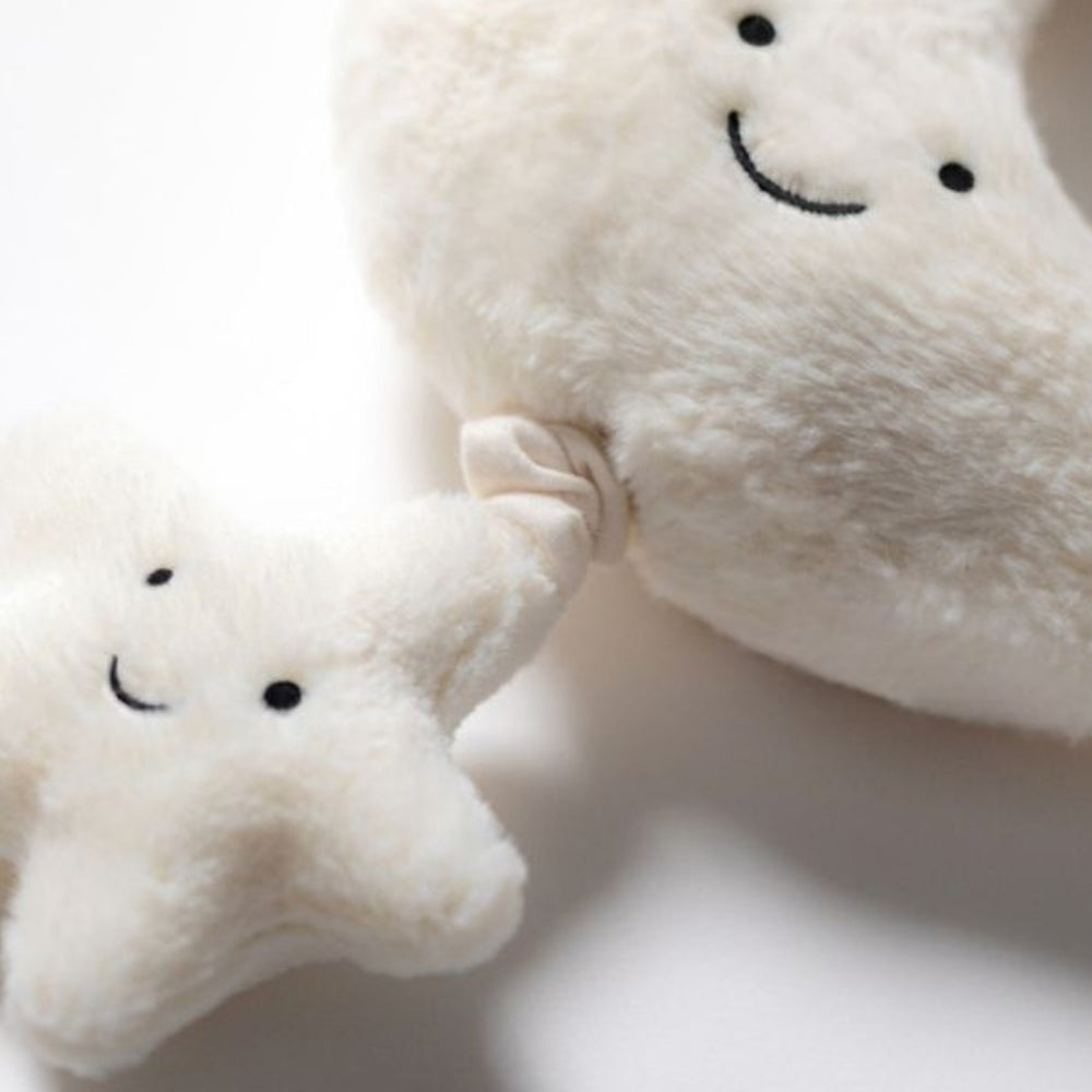 Мека и приятна на допир, луната нежно прегръща кремава, пухкава звезда, създавайки перфектния комплект за гушкане и прегръдки.