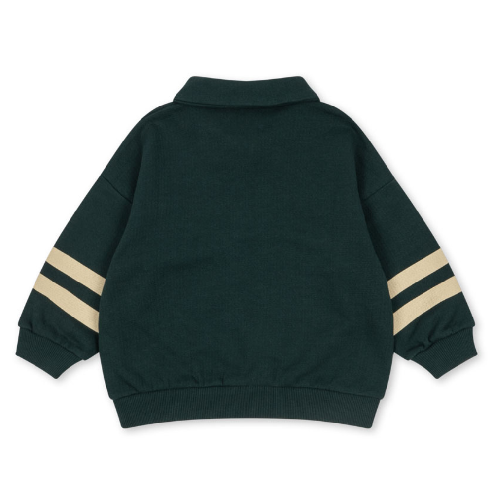 Суитшъртът от Konges Slojd с класически полуцип е удобен и мек вариант за всеки ден – идеален за детска градина, училище и уикенд екскурзии. Контрастните ивици по ръкавите придават спортен акцент, а ципът улеснява бързото обличане и регулиране на топлината.