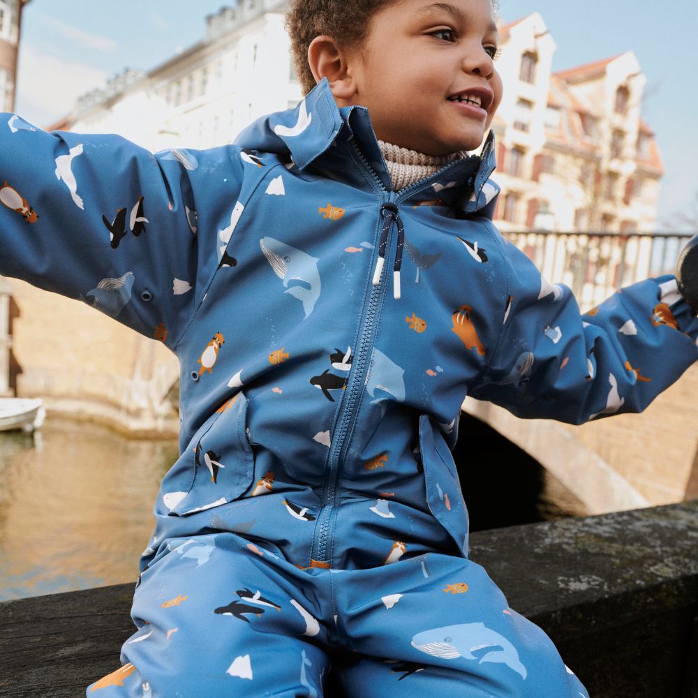 Водоустойчивостта до 12 000 mm воден стълб предпазва от влага при игра в снега или дъжда, а флисовата подплата в джобовете и регулируемите силиконови ремъци за краката предотвратяват проникването на вода и поддържат краката на детето сухи и топли.
